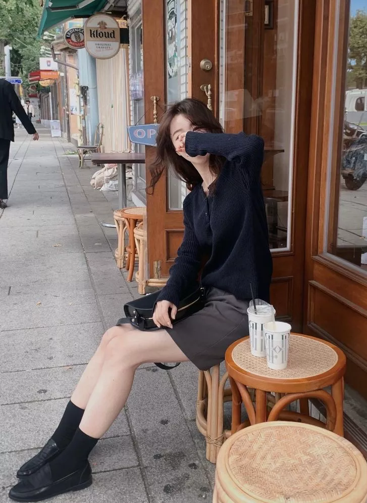 当开衫毛衣的下端变成一片,留出领口位置,一件具有小心机设计的毛衣就出来了,再搭配短裙与乐福鞋,学院风是什么?就是这样。