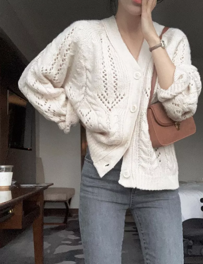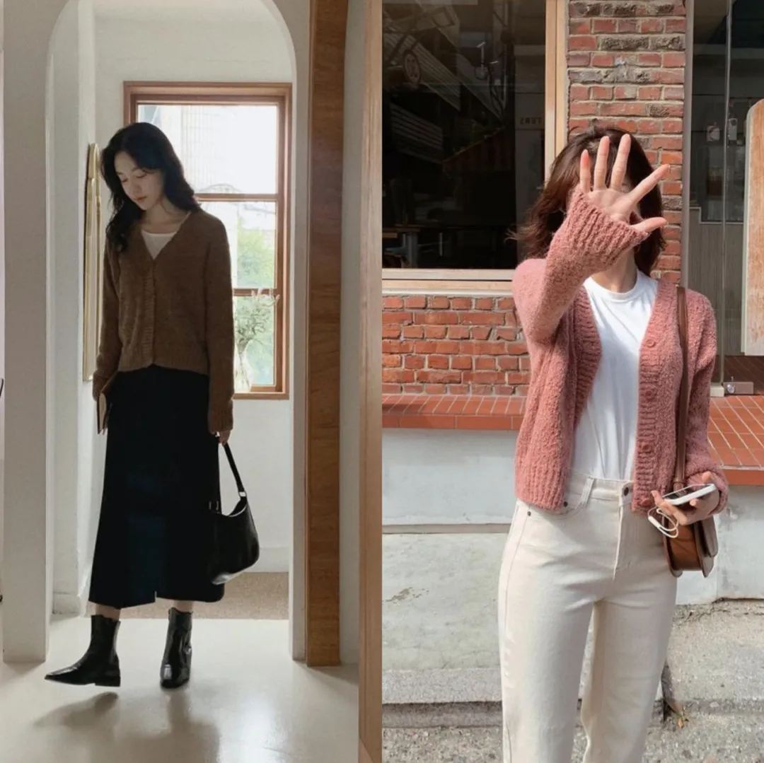 有别于针织衫开衫,毛衣开衫在秋天的穿搭频率很高,不同于风衣的板正,西装的中性,这件单品给人的感觉会更文静更温暖,也同时具有显瘦的效果。