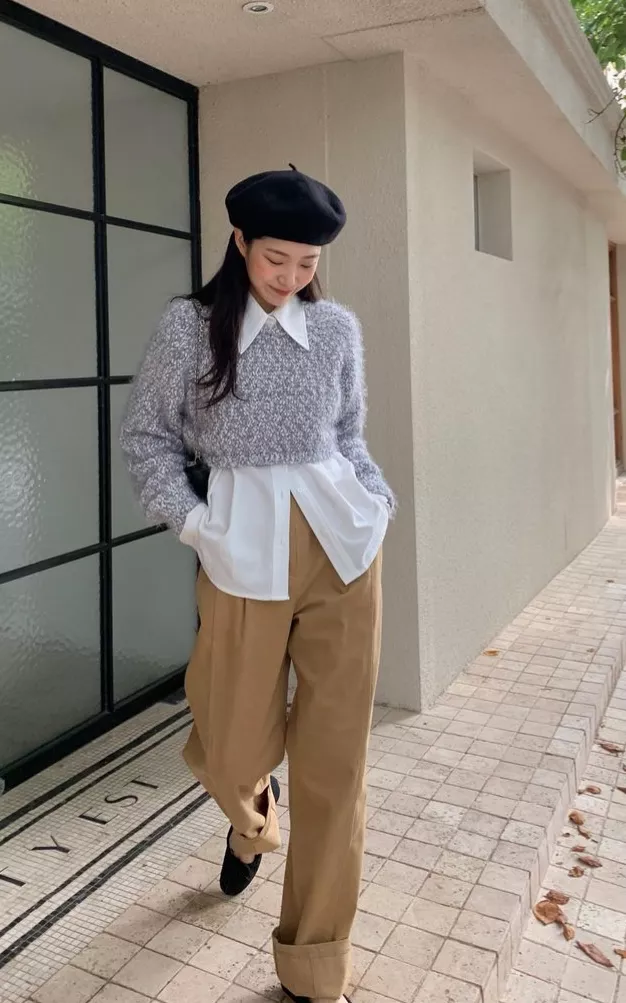 毛衣既然宽松,那就不能放过叠穿这样的方式,在宽松套头毛衣里面叠穿一件衬衫,穿搭品味上升了一个档次。