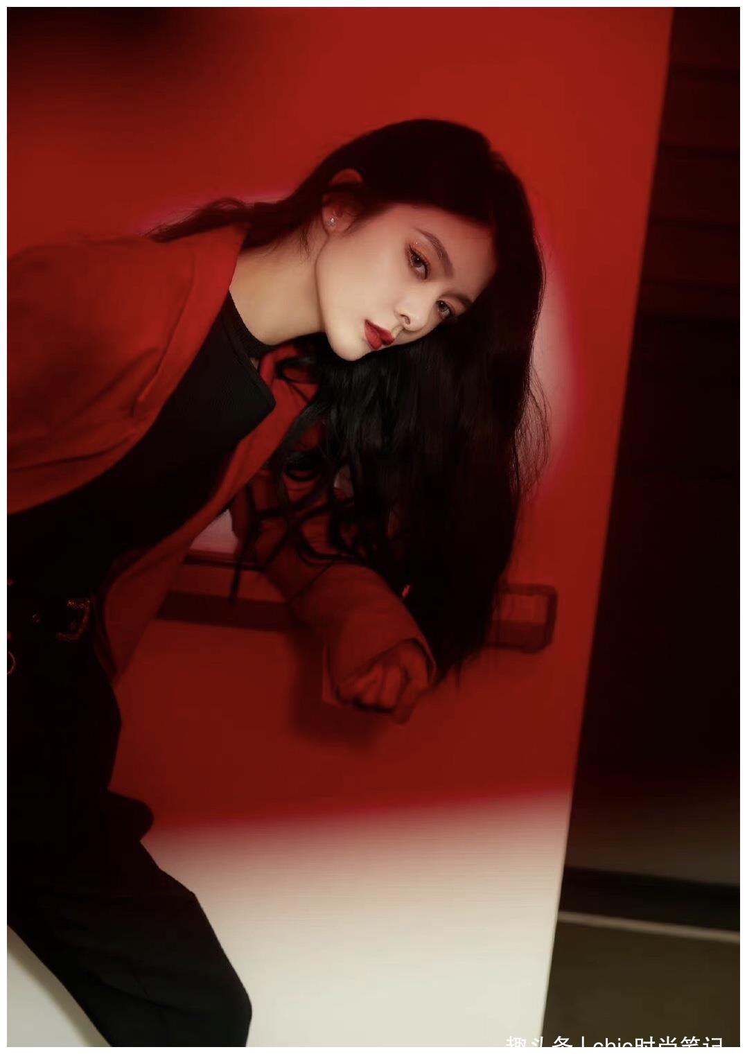 红色的西装配黑色的打底,强烈的色彩冲击如同她的面容一般,一下子就攥住了我们的眼球。