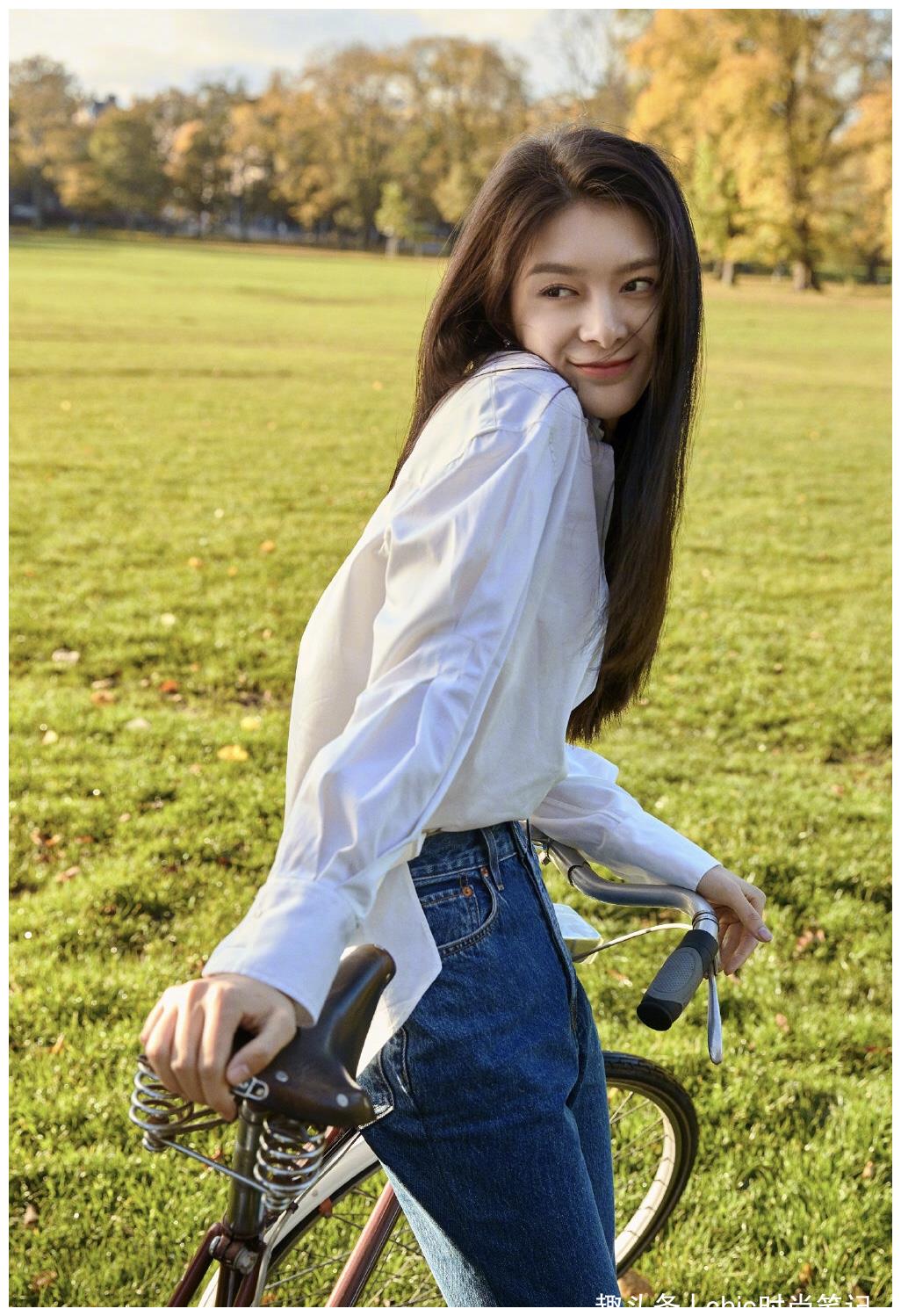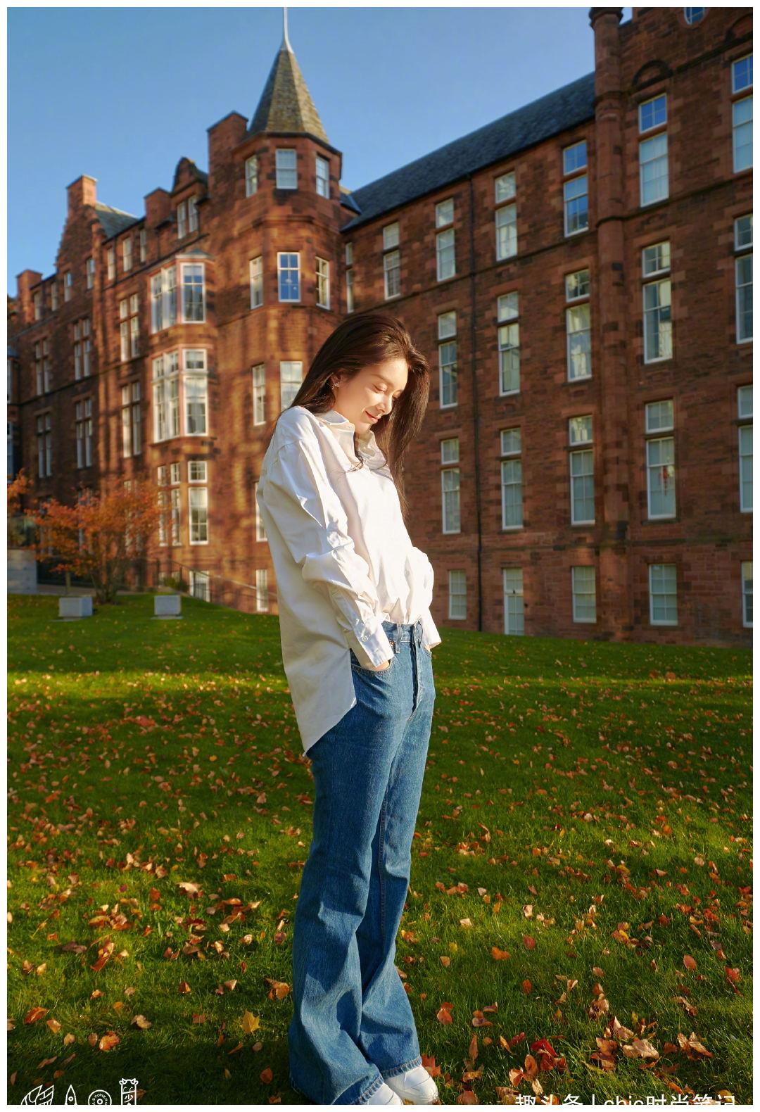 再说说衬衫,真的怎么有人把衬衫穿得这么好看!干干净净的不规则衬衫,加上微喇叭的牛仔裤,露出笨笨又憨态的鞋头,草坪的清脆和太阳光的醒目都成了她的陪衬。