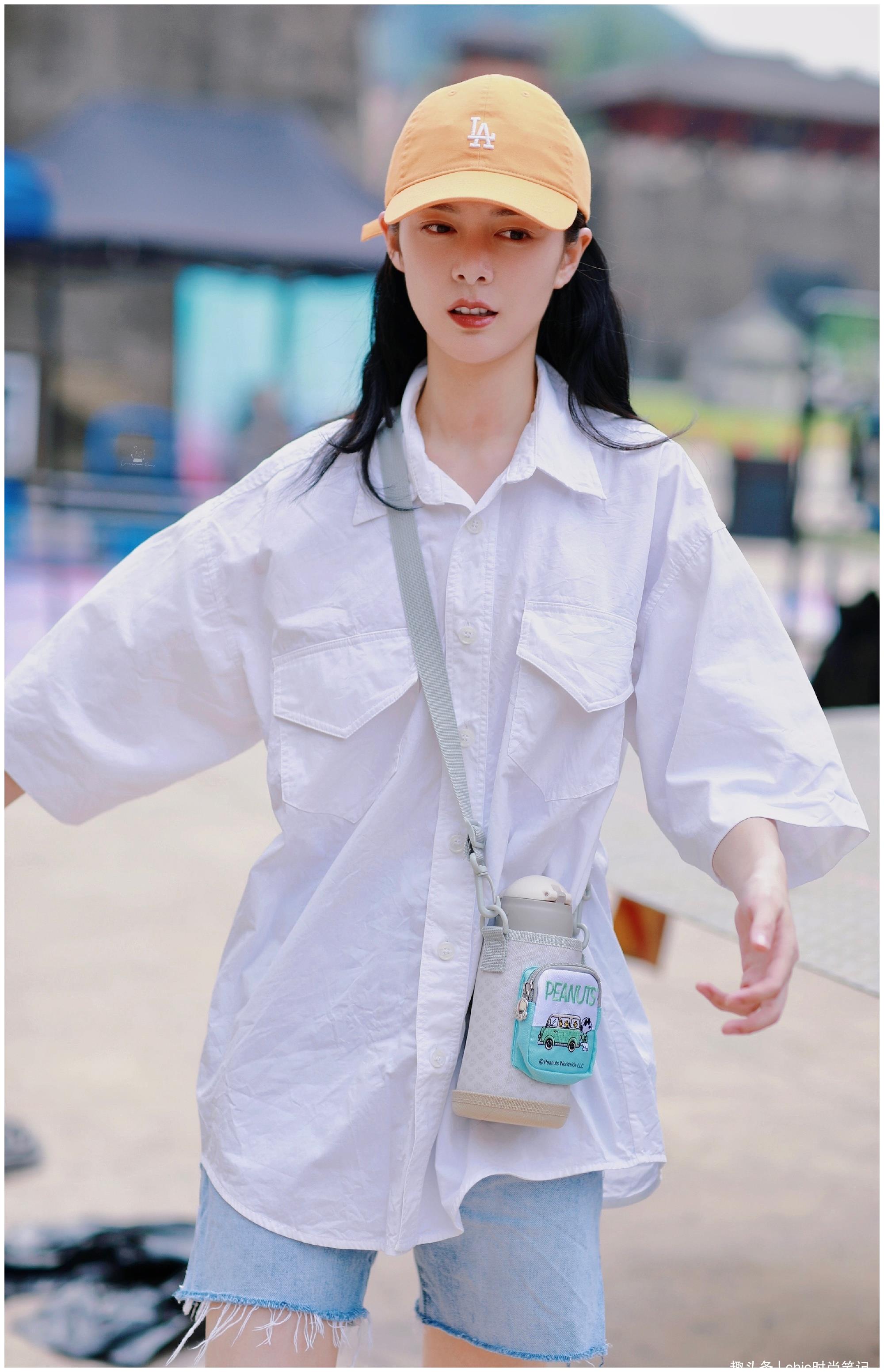 白衬衫短袖搭牛仔短裤,加上一顶黄色的鸭舌帽,有点孩子气,却也百搭,适合大部分的妹子穿,很盐系很耐看。