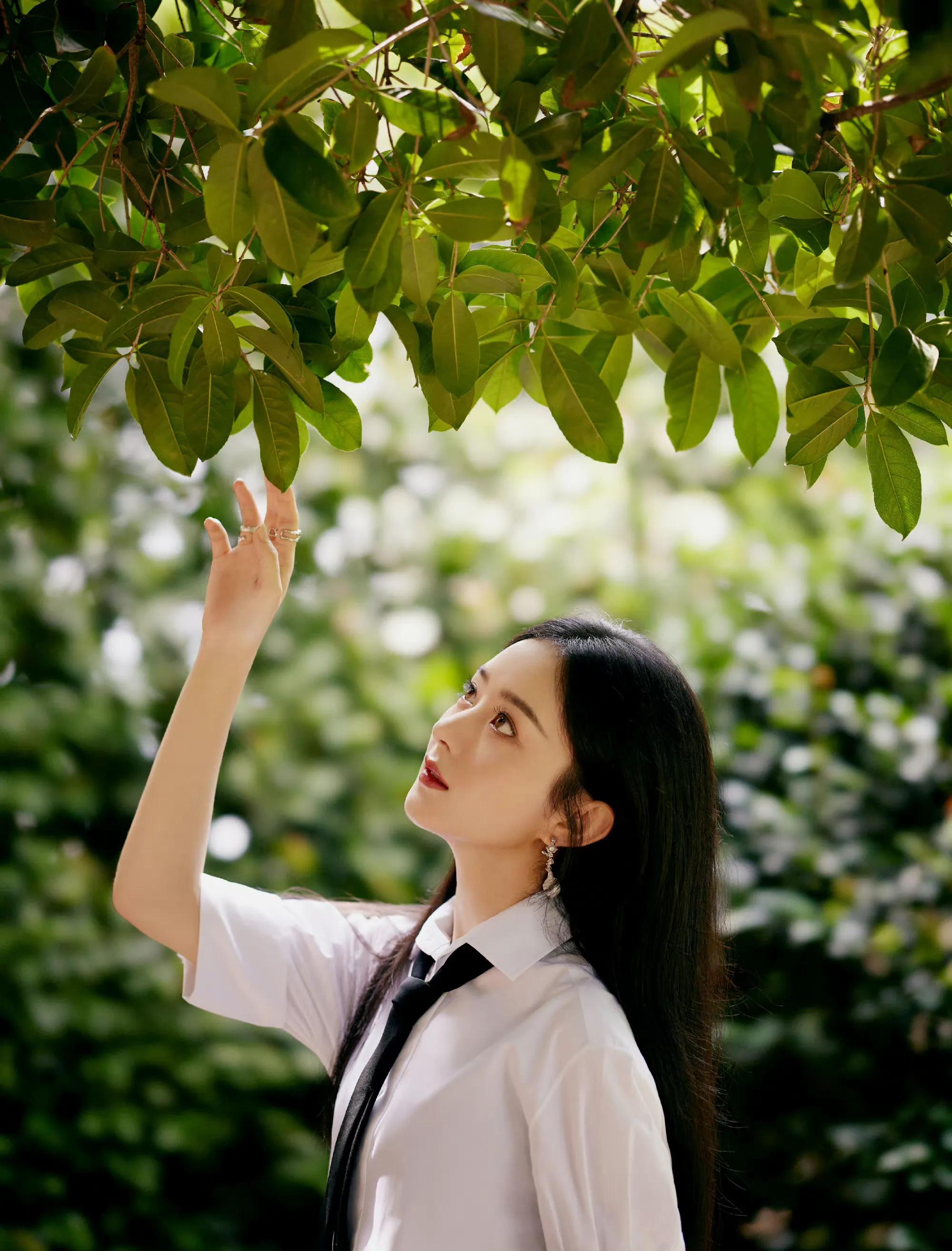 纯白衬衫打上小领带,搭配双排扣短裙和珍珠耳环,学院风气质的颖宝清甜满分!谁不想跟这样美貌的学姐一起上学呢?