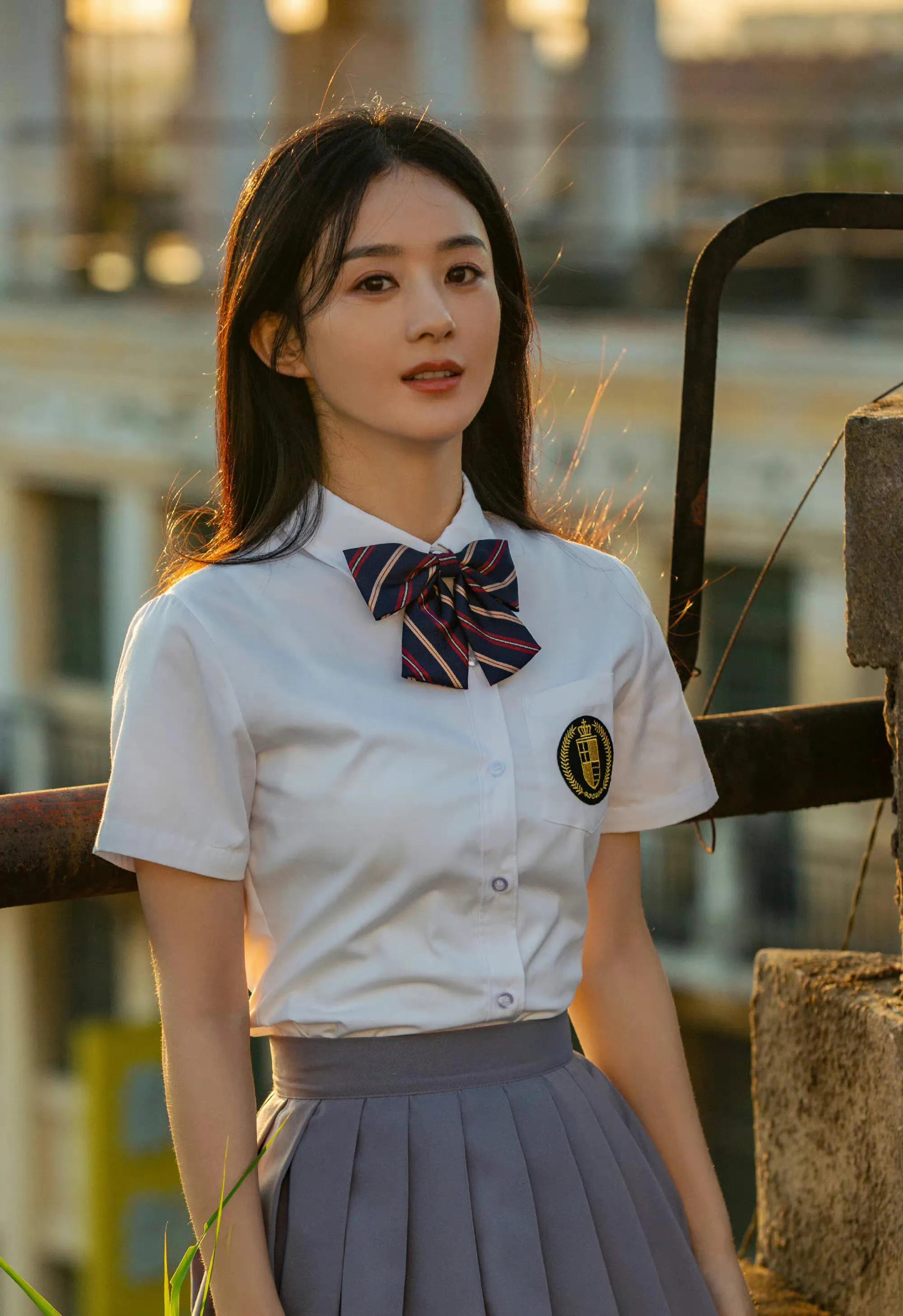 赵丽颖这一身好清爽,学院风造型少女感十足,拿着花坐在长椅上面的样子好娇羞,眼睛里好像有星星,整个人无比温柔。