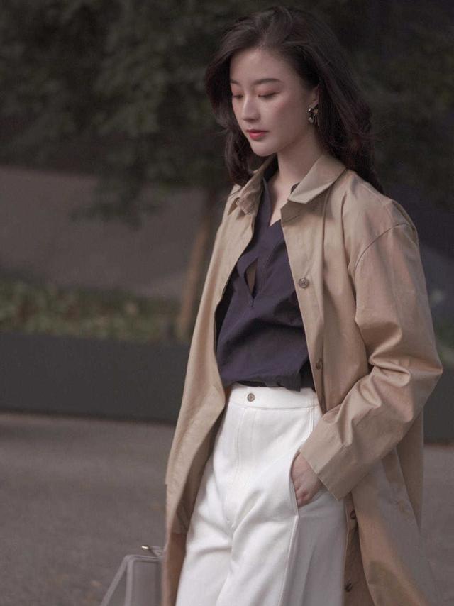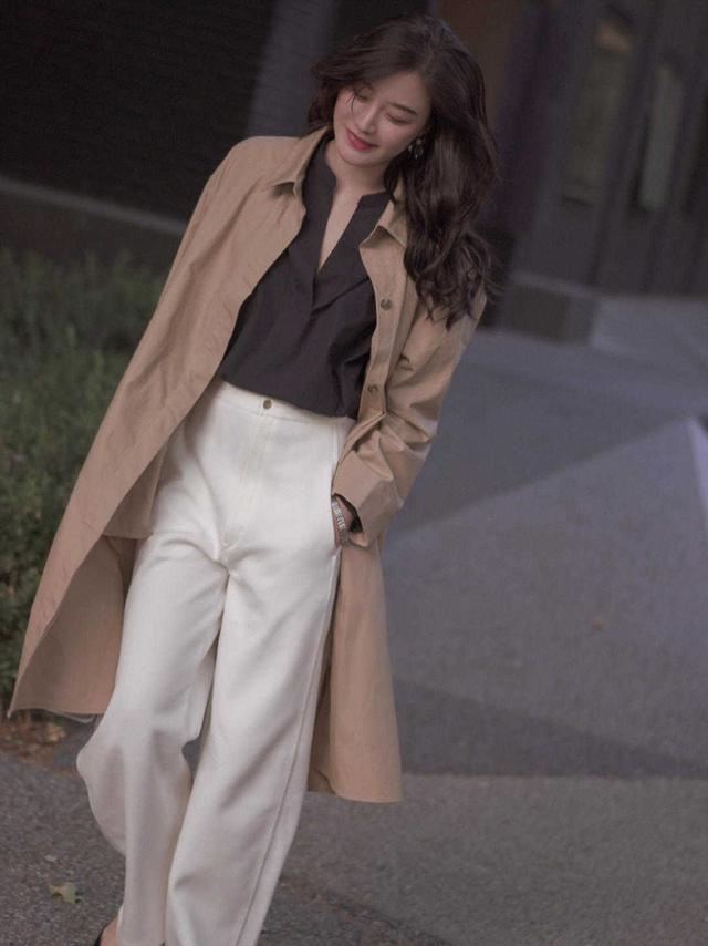 直接选择一条宽松的白裤子,来搭配一件衬衫大衣,也是属于风衣类型的,风衣给人的感觉本身就比较好搭,里面的内搭也可以选择一款比较轻松,又比较成熟的款式,内搭本身就是比较温柔的款式。