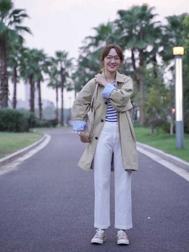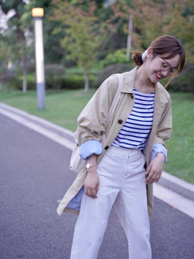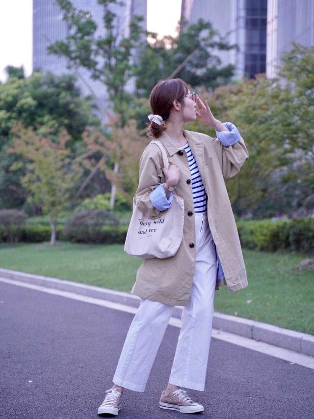 直接选择一款白色的烟管裤,然后来搭配风衣,内搭可以选择白色的T恤,也可以选择条纹T恤,条纹T恤穿搭效果也好,就会显得年轻很多,也不会显得太单一,这样穿起来就会显得高级又优雅,所以白裤子的搭配也很简单的。