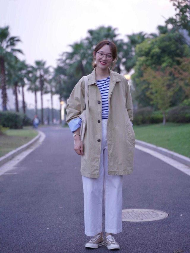 秋天这样的天气就很适合风衣的穿搭,虽然款式比较长,而且款式也比较宽松一点,但其实风衣并没有那么厚,可以搭配一款简单的内搭,就算天气炎热也可以,天气稍微寒冷一点也可以。