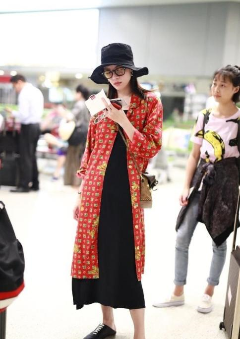 以红色作为底色,饱和度很高,颜色也很靓丽,前面结合了绿色的印花设计则能够丰富整个造型,显得很别致,而且还结合了金色的花朵图案,则能够进一步凸显出雍容华贵的气息,这种花色其实是比较显老的,只有气质特别出众的人才能够完美地hold住,一般人穿上之后可能会瞬间老十岁,大家一定要谨慎的选择。钟楚曦真是行走的“衣架子”,印花衬衫配黑色连衣裙,潇洒不羁。