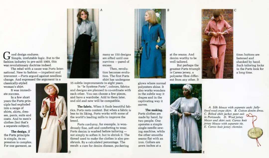 “时间巨轮”来到20世纪70年代,Luke Tanabe先生两位才华横溢的女儿Christine 和 Miki Tanabe姐妹成为了PORTS的主力设计师。1972年,PORTS正式推出男装线,为精英男士打造绅士品质着装,环球旅者风衣(The Internationalist)在70年代风靡全球,成为当时精英男士商旅出行的不二之选。1976年,PORTS独创性地提出了“LE SYSTÈME”(法语,意为THE SYSTEM)--衣着系统的穿衣理论,两位设计师想要帮助当代女性探索多元化风格搭配,打造属于自己的完美衣橱。