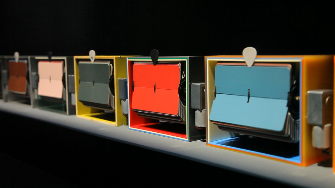 艺术家梁远苇特别为PORTS宝姿六十周年纪念创作了“行记”系列——绘画作品《行记 2021》、 视频装置作品《山》,以及机械装置《海》。令人印象深刻的是机械装置《海》,它的每个单元含60个页片,每个页片画面为一个色彩,而这些色彩的选取都是来自于宝姿全新2021秋冬系列的配色方案,每个单元共60个色彩。整组装置的色彩呈海浪形式变化翻滚。