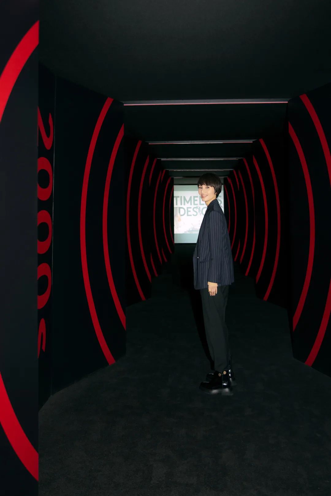 剪裁利落的PORTS 1961条纹西装很适合穿越品牌的“时间隧道”,袁泉用踝靴和阔腿裤做搭配,中性酷感“拉满”。