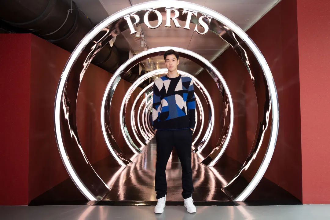 李铢衔James穿着PORTS INTERNATIONAL几何图案拼接毛衣、简约长裤,轻松休闲地来逛个展。