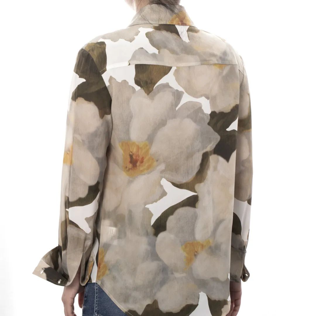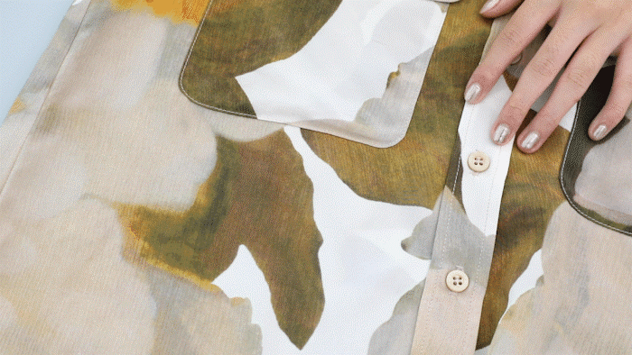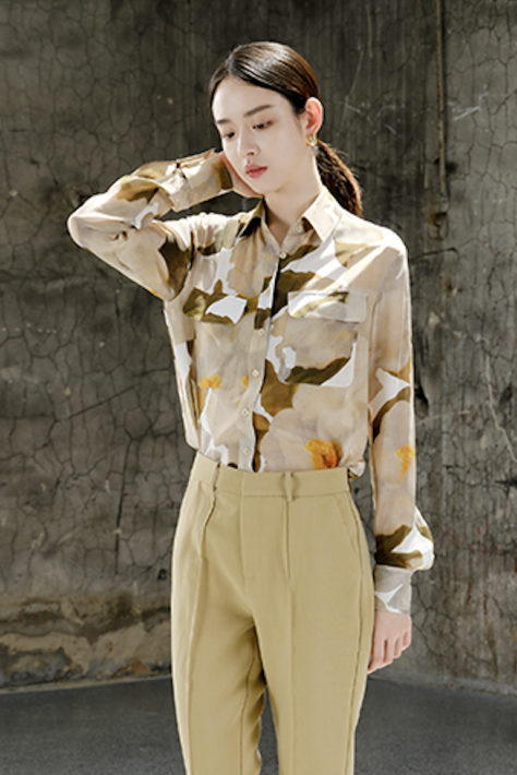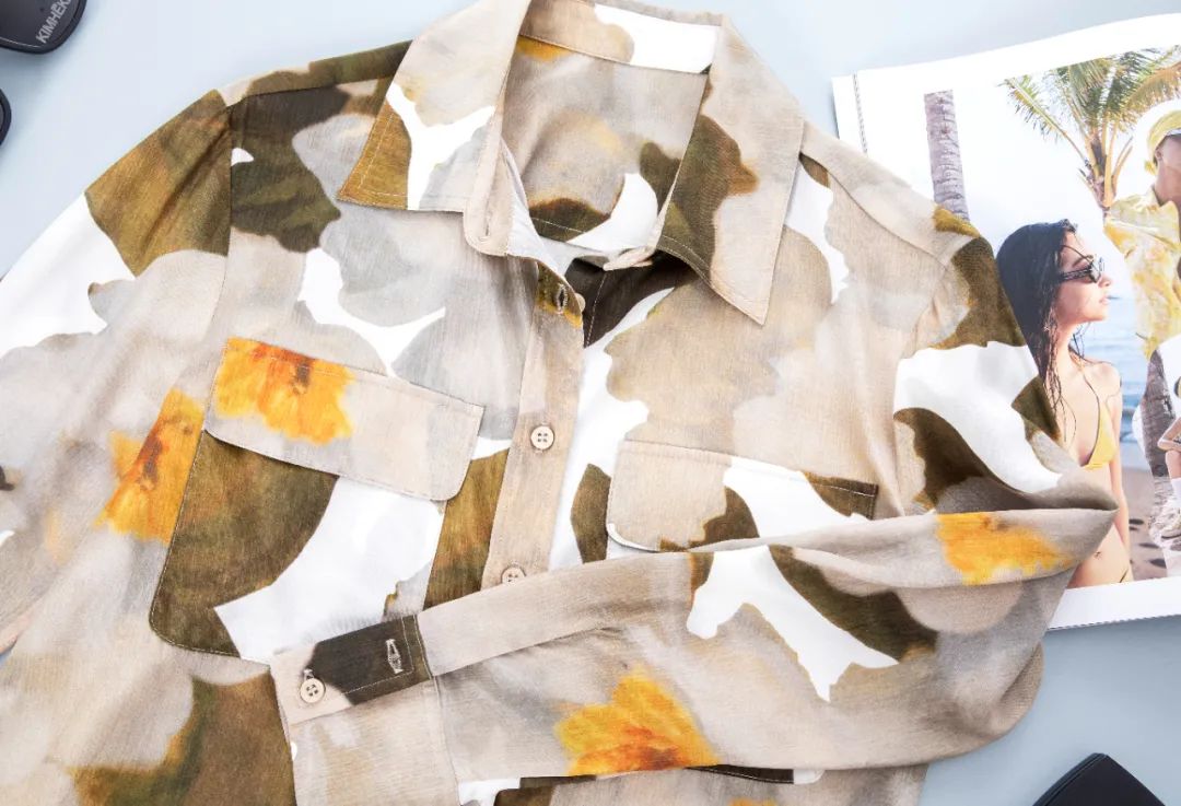 潇洒的工装双口袋设计、油画感绿色印花,让这件衬衫中和了柔美和飒爽,不同女生能穿出不同感觉。