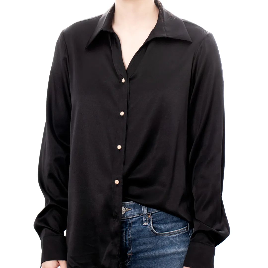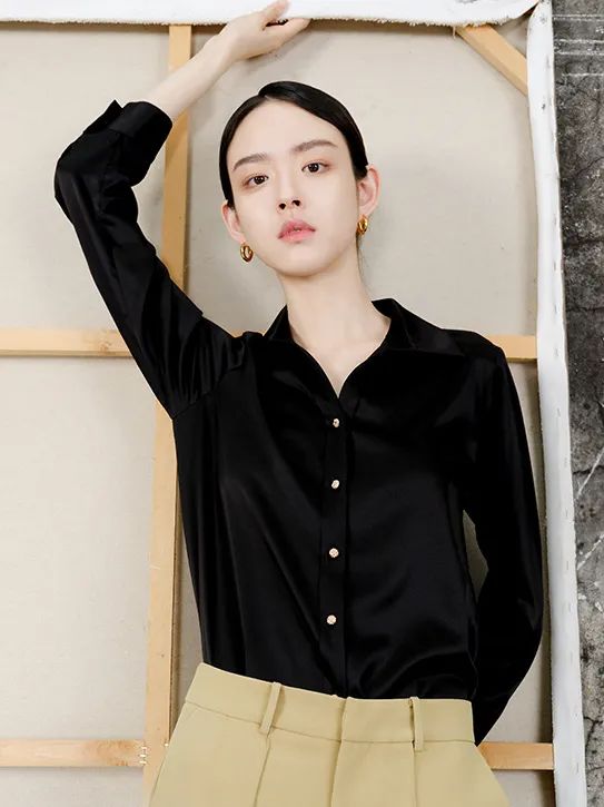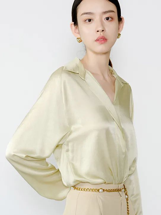 这一款也是弹力缎面料,耐穿、实穿。第一次选择真丝衬衫的姐妹,可以入手这个百搭基础款。