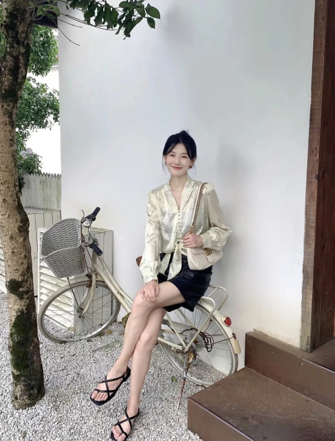 哪怕遮着脸,你也能感受到满屏的温柔气息。夕阳余晖下,美丽的女人穿着真丝衬衫,仿佛刚从画里走出来游历人间。