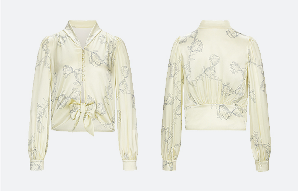 米黄色的底色上勾勒出几朵素色小花,温柔而精致;微微灯笼袖和系带设计,随便穿一件普通的裤子就能显得很有设计感了。