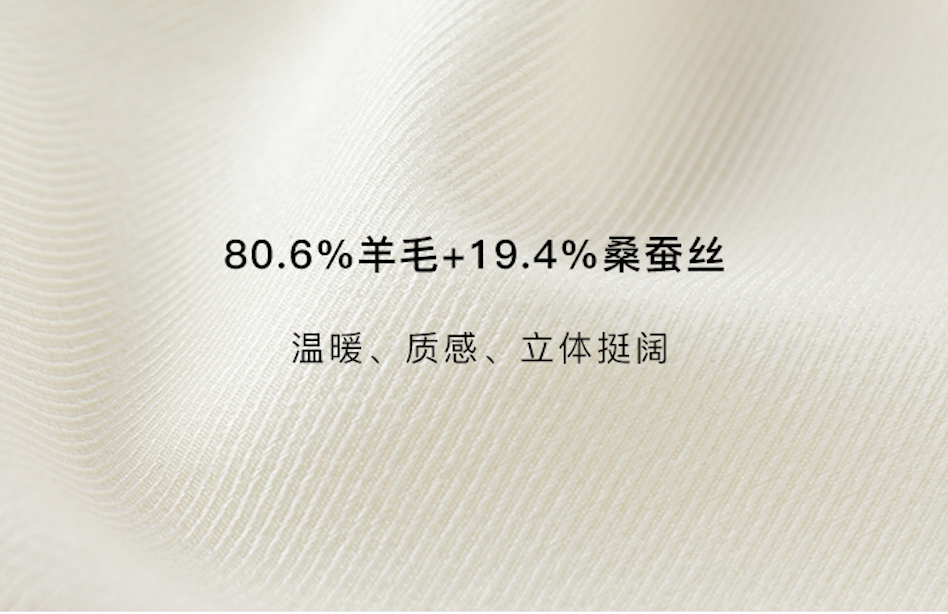 80.6%羊毛+19.4桑蚕丝混纺面料,温柔且细腻。