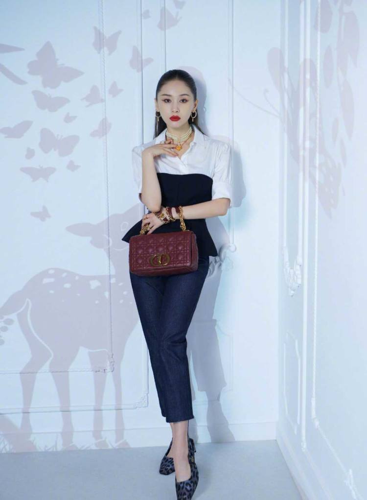 王子文在腿上搭配了一款修身款式的牛仔裤,适当修身的款式设计对于王子文这种身形非常骨感匀称的小姐姐们来讲是非常友好的,通过这种适当修身感将腿型的优越感呈现出来,搭配上9分的长度设计,既显身材又显利落感。