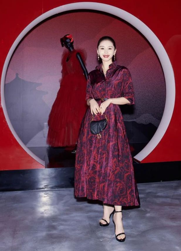 红黑色搭配到一起很容易呈现出一种显老气的感觉,尤其是这种暗淡的红色,但是这款连衣裙穿在王子文身上却一点显老的感觉都没有,搭配高腰线和解开领口的穿衣方式,反而将这款色彩显老的连衣裙穿出时髦感。