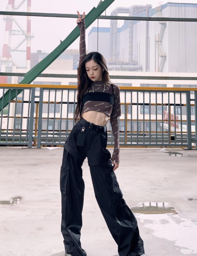 希林娜依·高在穿搭造型上非常大胆,对各种服饰单品都有很强驾驭能力,这次穿着巧克力色炫腹装出镜,版型款式颇为简洁,加入印花元素点缀充满精致亮点,最特别的是在胸前用黑色面料拼接,看起来很有设计感;下面搭配黑色长裤,阔腿裤版型拉长身形比例,愈发高挑帅气。
