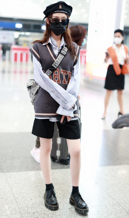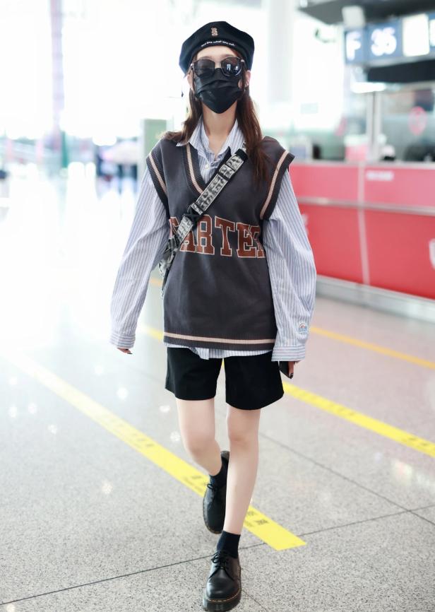 希林娜依·高机场私服,针织背心叠穿条纹衬衫,学院风造型演绎甜酷女孩。最近希林娜依·高在机场现身,这套私服look就很漂亮,有点类似学院风的造型,却富有独特个性化色彩,演绎甜酷女孩。白色衬衣作为内搭单品,浅灰条纹点缀清雅大方,外搭灰色针织背心马甲,两者叠穿富有设计感,下面是一条黑色休闲短裤,脚踩黑色短袜和小皮鞋,戴上学院帽和墨镜,尽显甜酷女孩魅力。