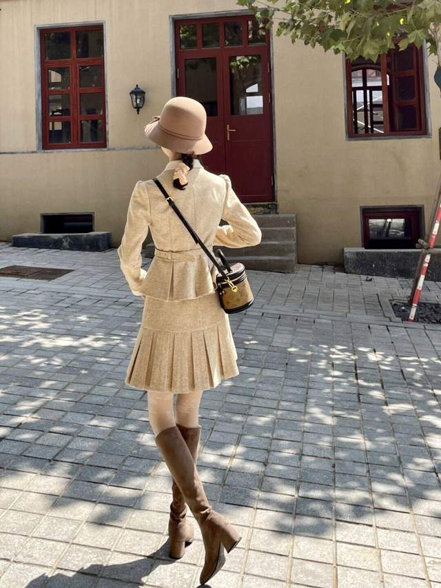 下半身搭配的是一条百褶半身裙,这条裙子的长度是刚好合适的,比较适合小个子的女生穿。这一整套的搭配,不论是面料还是版型都是很好的,穿起来很有质感。