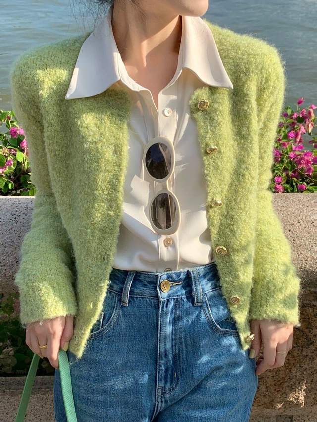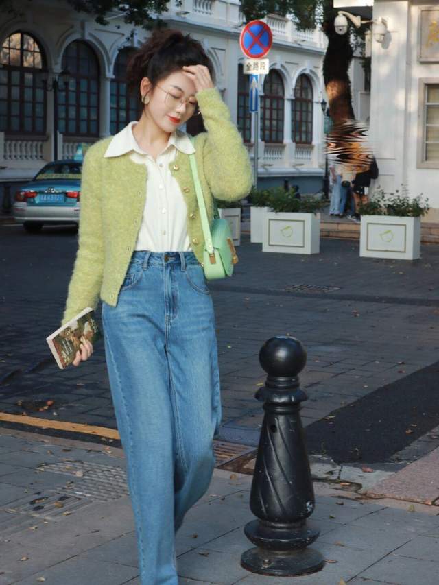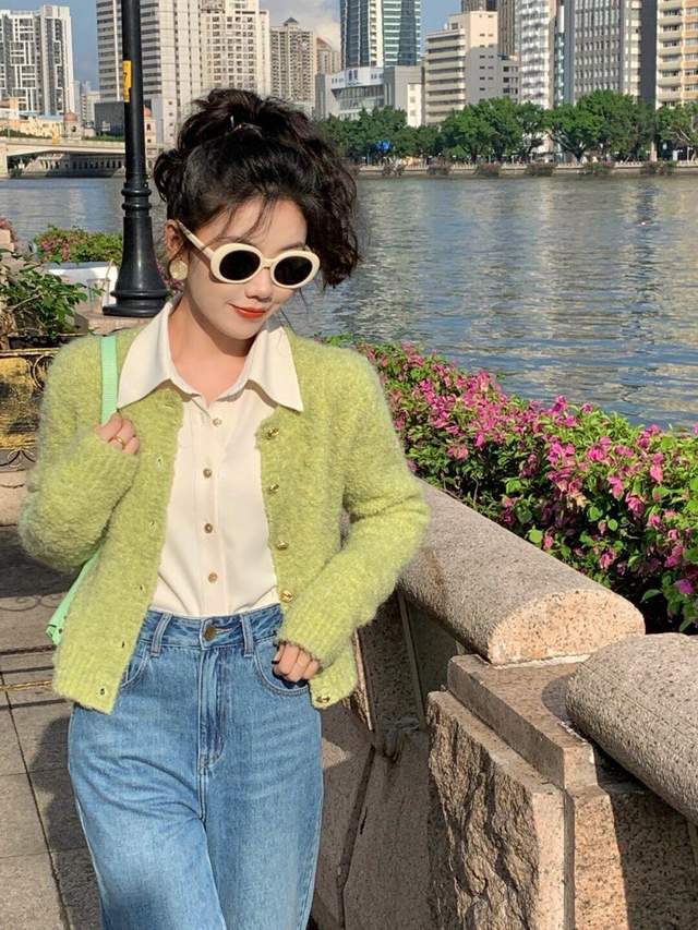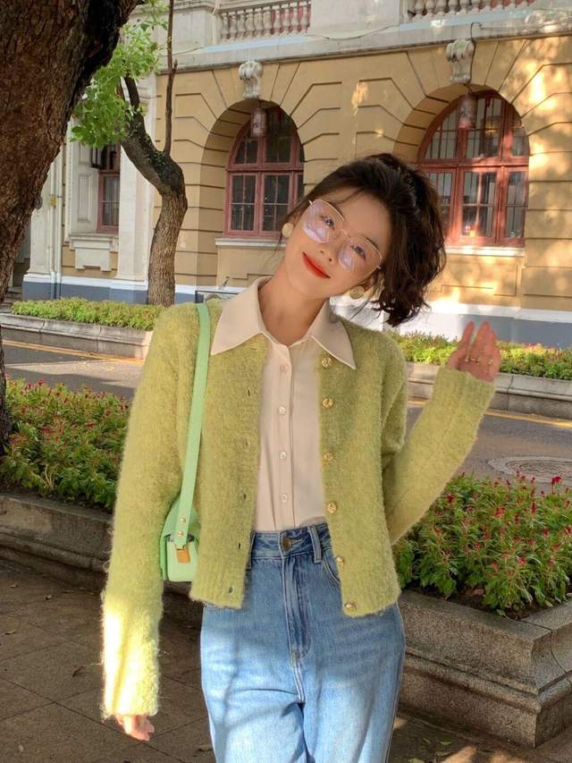 同样是白衬衫的基础搭配,这位穿搭博主她搭配了一件嫩绿色的毛衣,这件毛衣的面料是很柔软的,穿起来很舒服,毛衣上的纽扣也比较复古,搭配起来比较别致。