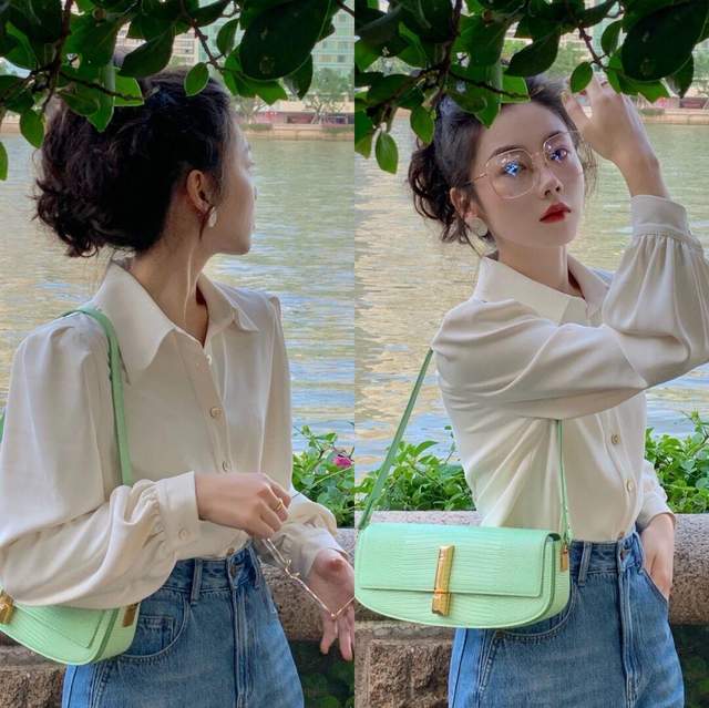 在配饰的选择上,可以选择一些大量感的耳饰或者是锁骨项链,整体搭配起来更加的精致。而且这款衬衫,她还有一个泡泡袖的设计,穿起来更加的显直角肩,能够修饰肩颈的线条。