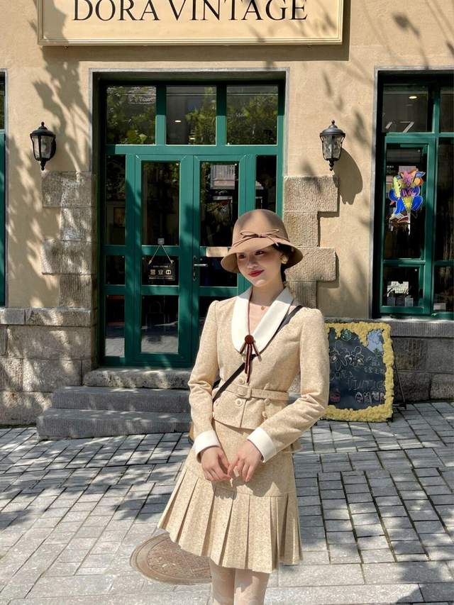其实,小个子女生还可以尝试一下复古的法式套装,这位穿搭博主,她上衣选择的是一件小西装,这件外套的领口是一个白色v领的领口,看起来很显瘦,而且还能够很好地修饰脸型。日常出门的话,可以搭配一条锁骨项链会更加的精致。