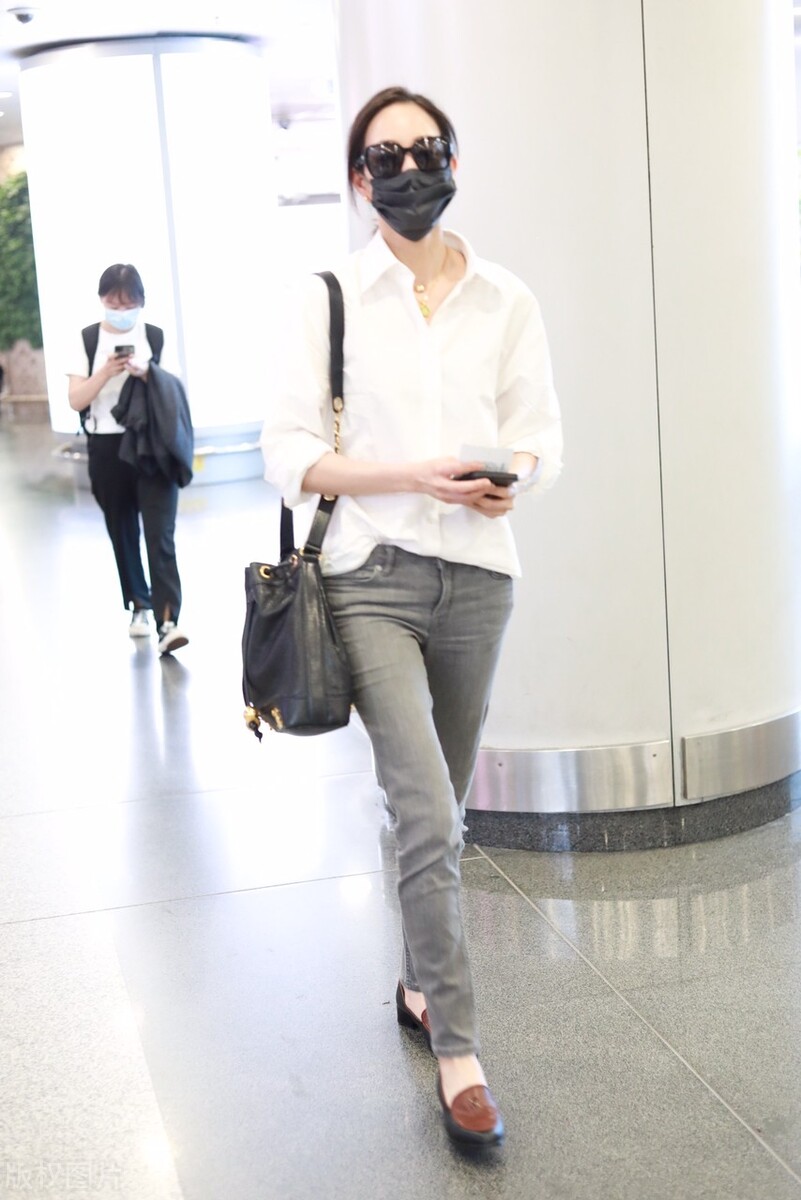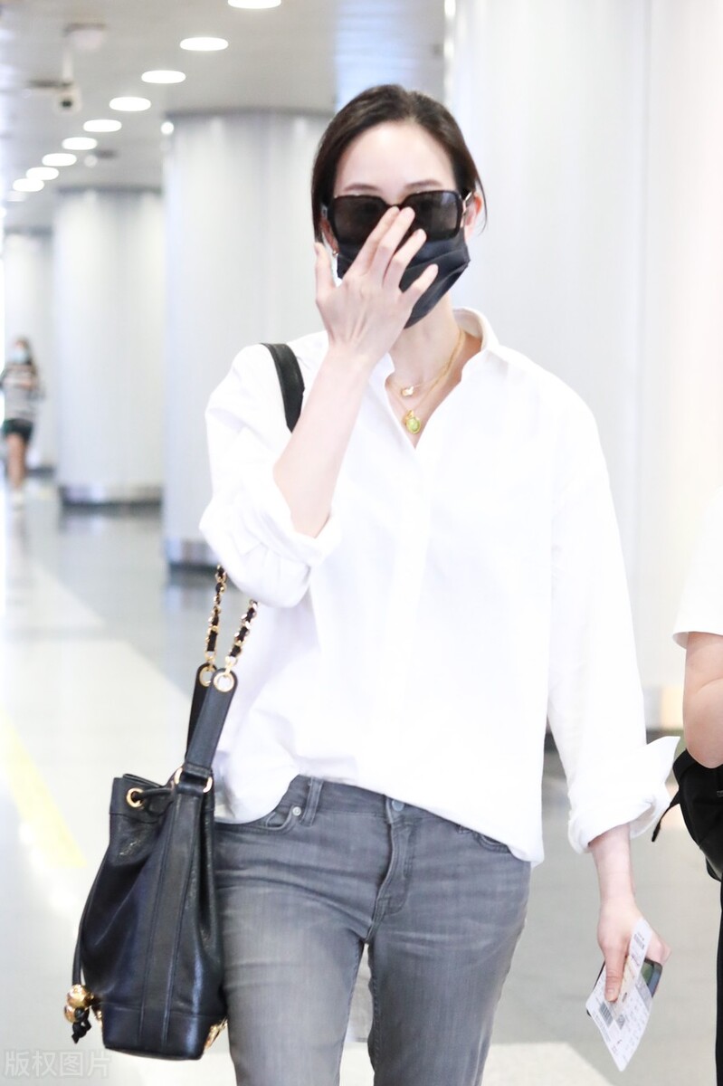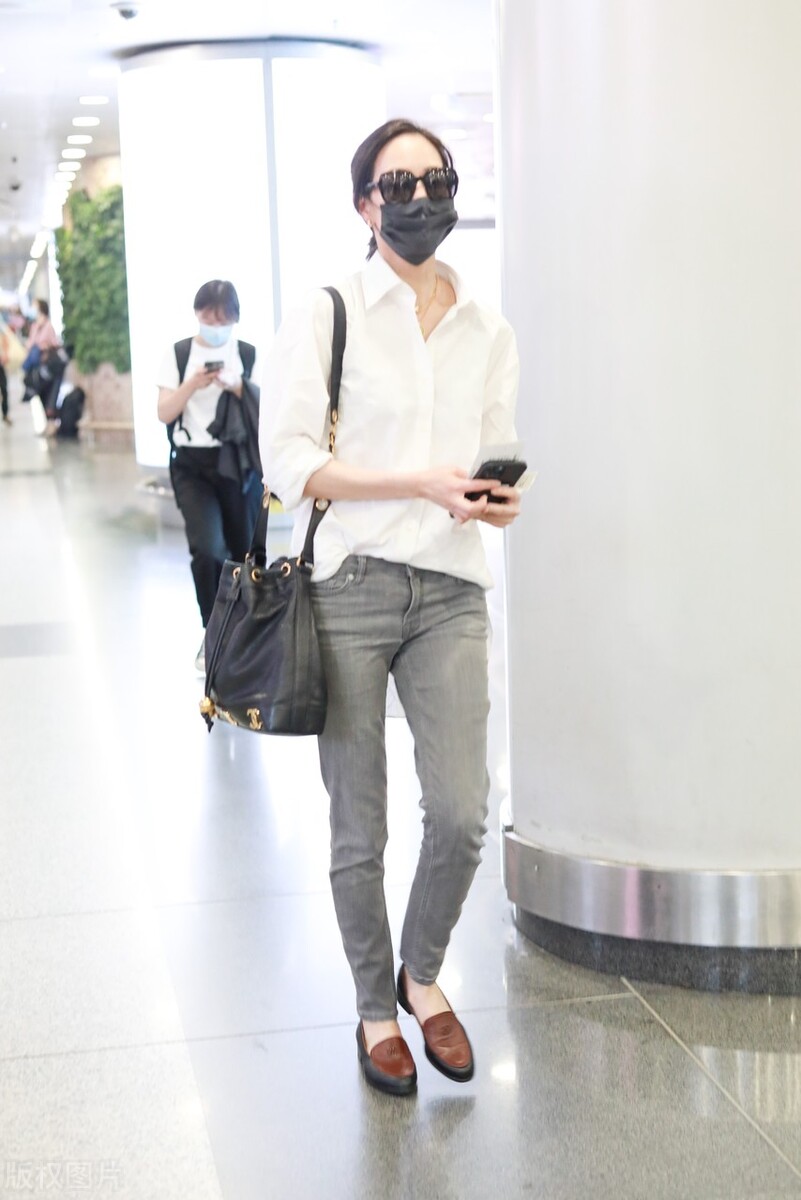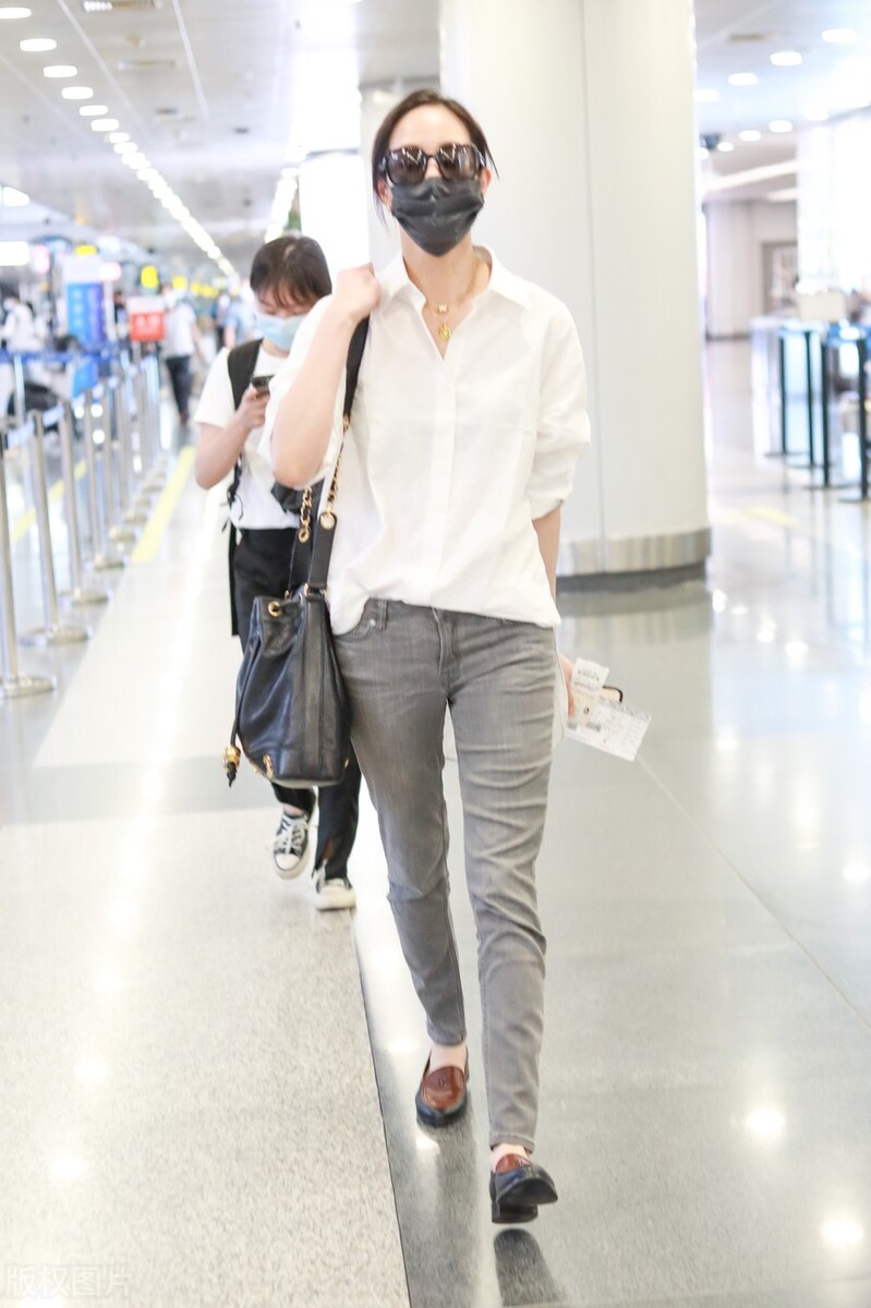 张钧甯穿白色衬衫搭配灰色牛仔裤,背黑色单肩包休闲随性