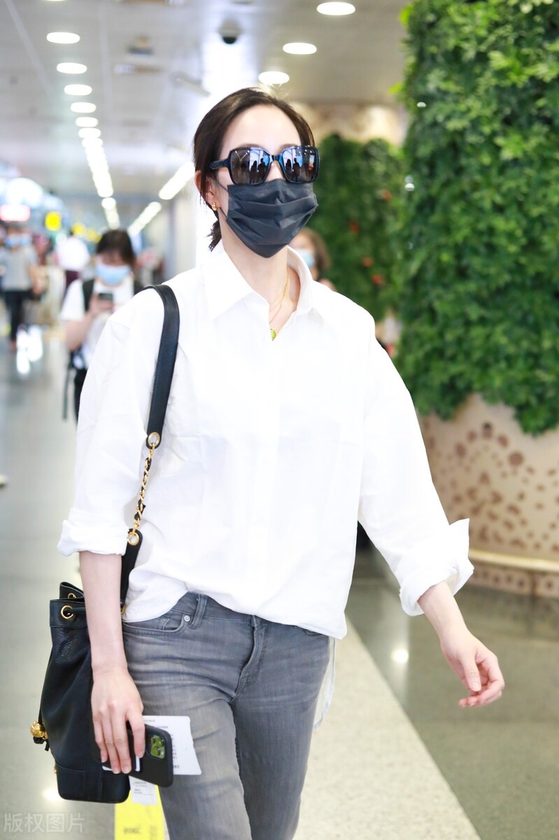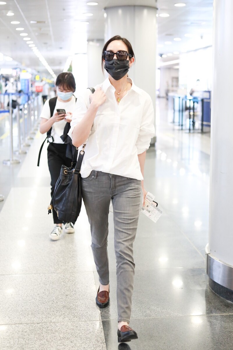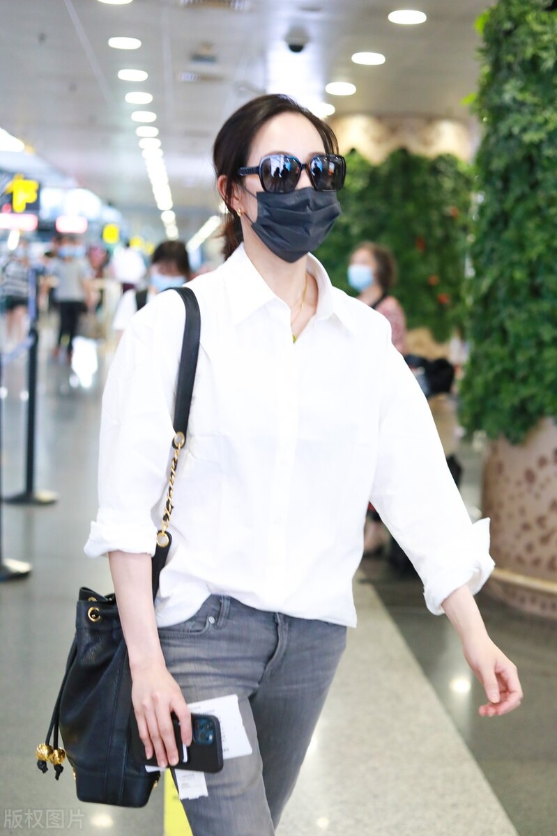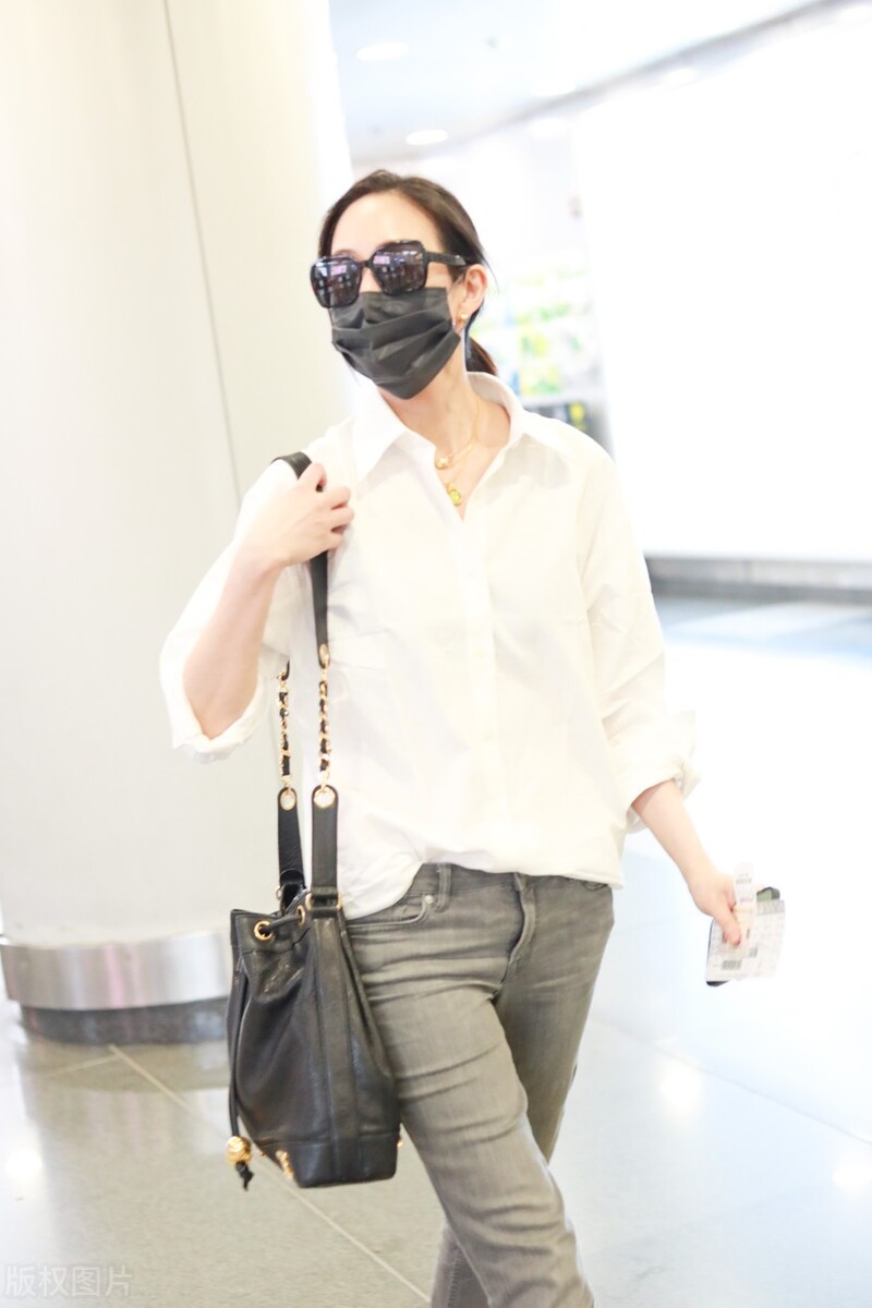 张钧甯穿白色衬衫搭配灰色牛仔裤,背黑色单肩包休闲随性