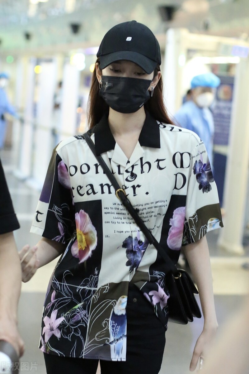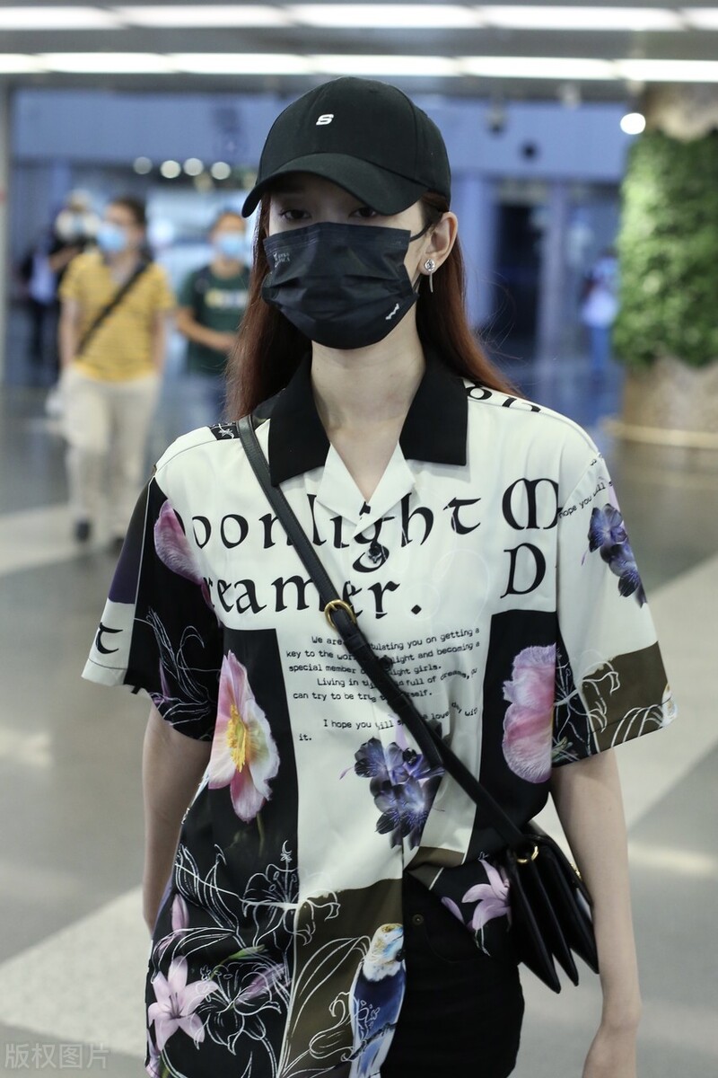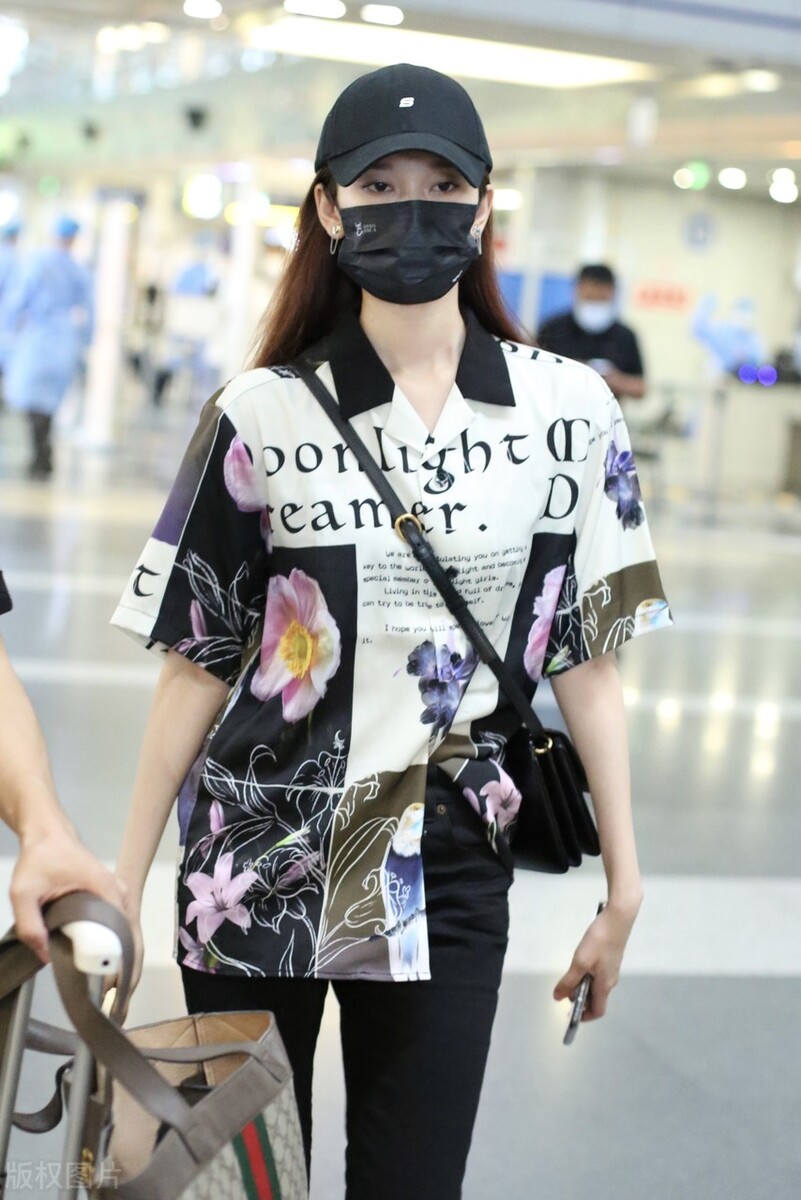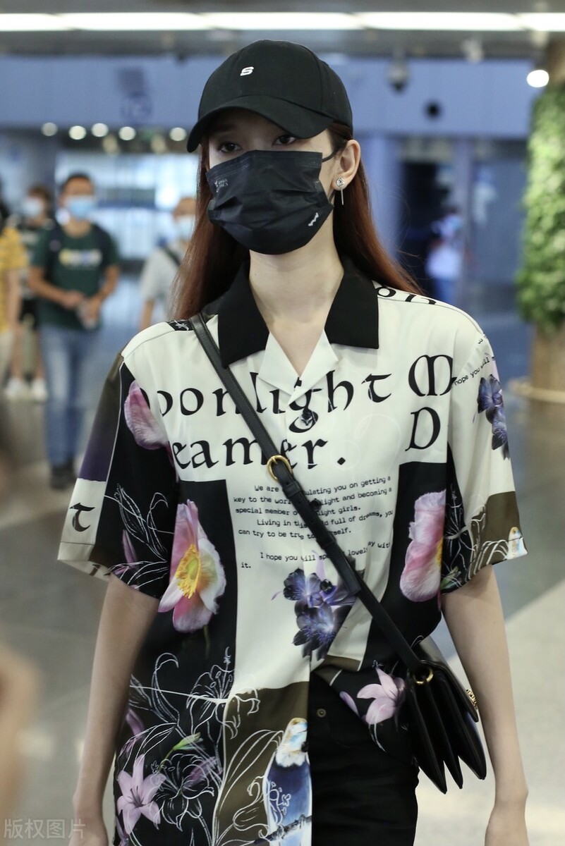 > 刘令姿穿印花衬衫搭配黑色打底裤,戴黑色棒球帽时尚干练