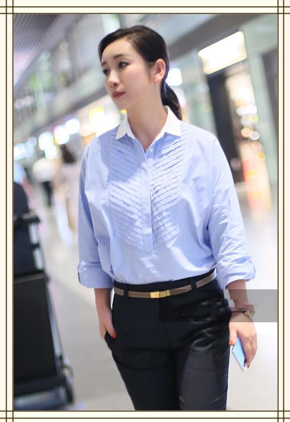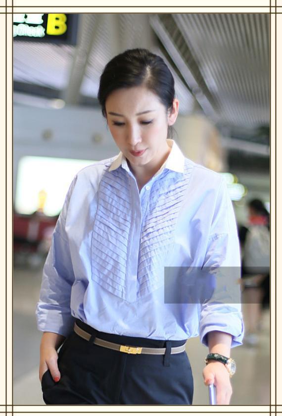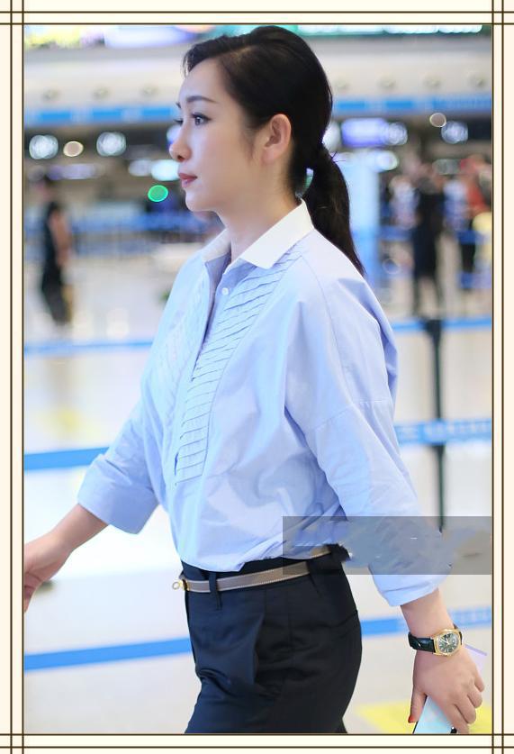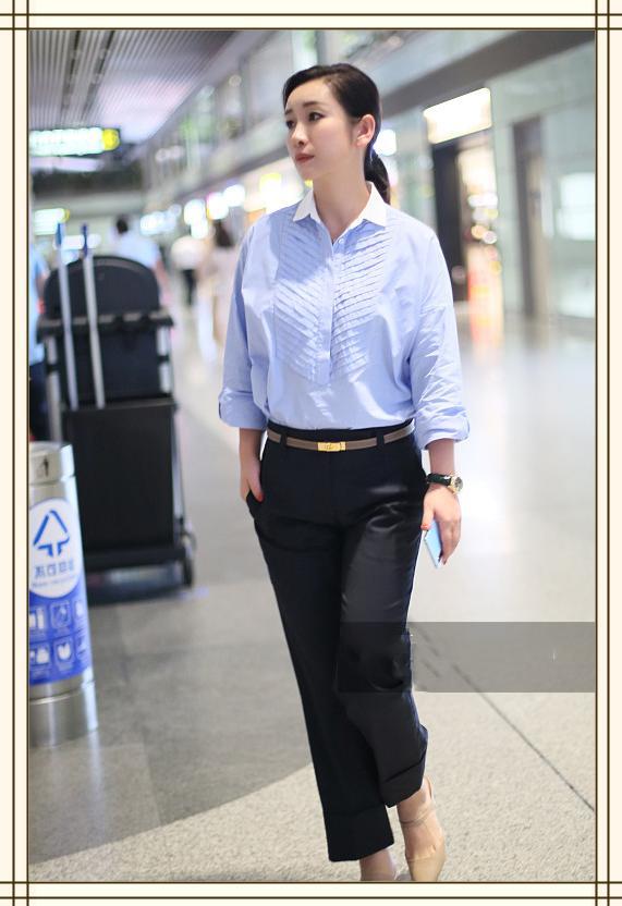 蓝色的休闲衬衫搭配这条黑色的九分裤,虽然比较简约,但也掩盖不了秦海璐的优雅大气感。黑色的手表让人看起来沉稳且职业,和衬衫刚好相得益彰。棕色的细腰带为整体的造型提亮,明显的拉长比例,手表和腰带为这身装扮加分不少。