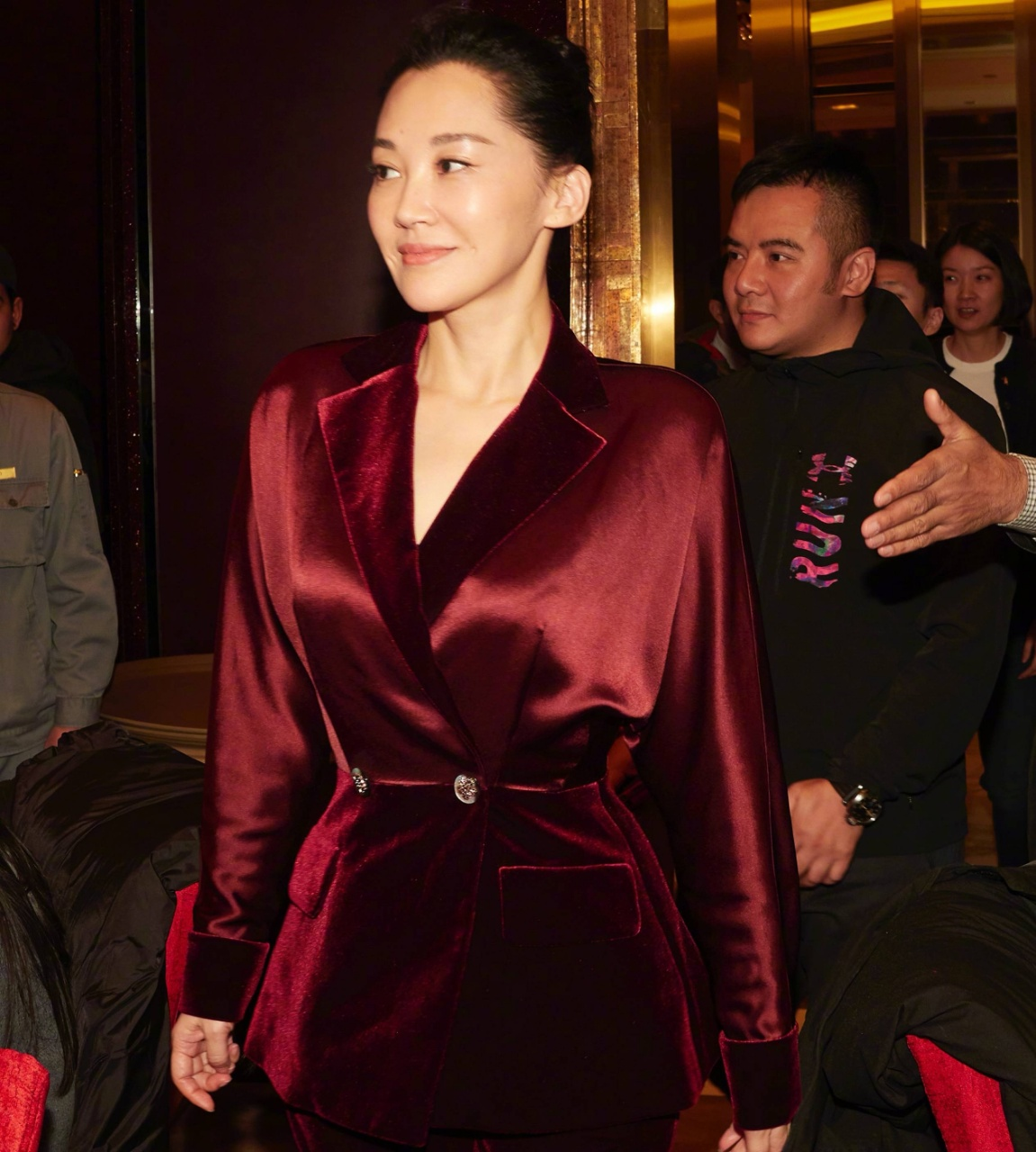 丝绒材质的西装从视觉上来看就非常具有设计感,而且许晴搭配的酒红色西装,更能体现她的时髦气质,酒红色看起来低调且高级,修饰了她的肤色,整个人也瞬间变得优雅了不少。如果你存在肤色暗沉的问题,也可以尝试这种酒红色单品。