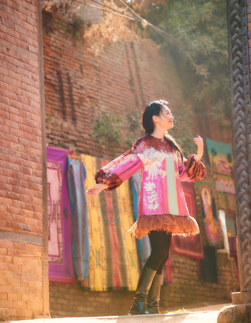 有的人之所以穿着时尚,是因为他们懂得利用不同服饰来进行混搭,这样既能够避免和别人撞衫,同时还能够穿出独特的韵味,下面的许晴选择了一件粉色印花上衣,搭配黑色打底裤以及黑色的靴子,这种深浅结合反而会很有亮点,也能够让她看起来更年轻。