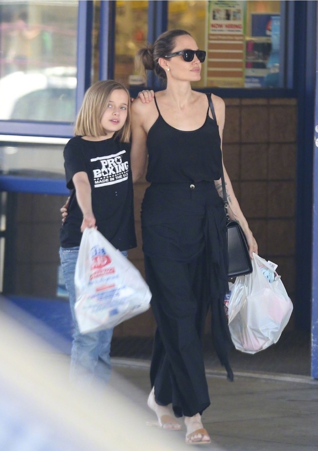 当然,同色系的搭配最经典,也不容易出错,黑色系的服饰很适合成熟女性简洁。 借鉴。 安吉丽娜·朱莉这一身黑色吊带和阔腿裤的搭配就超级时髦。黑色吊带休闲中不乏性感的气质,和阔腿裤混搭,也能增强她的气场。