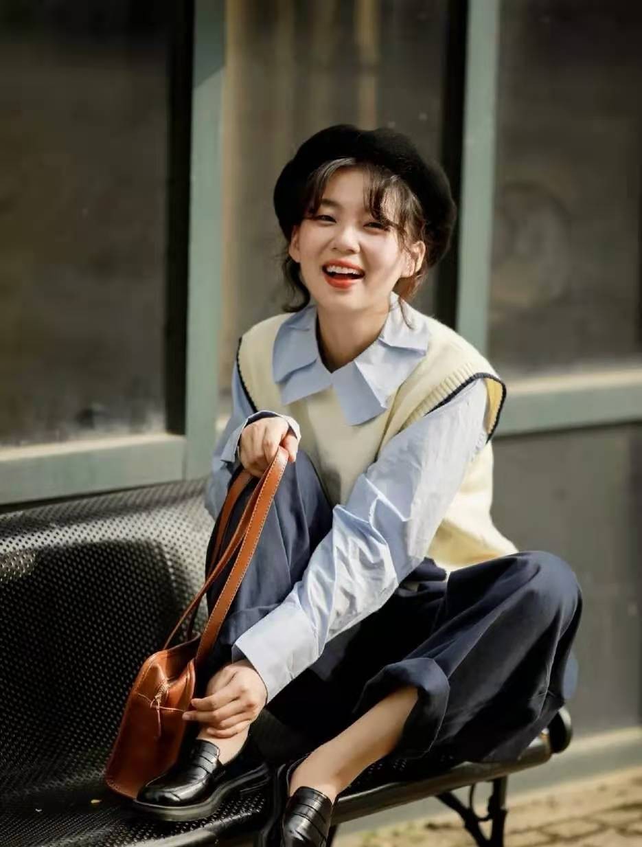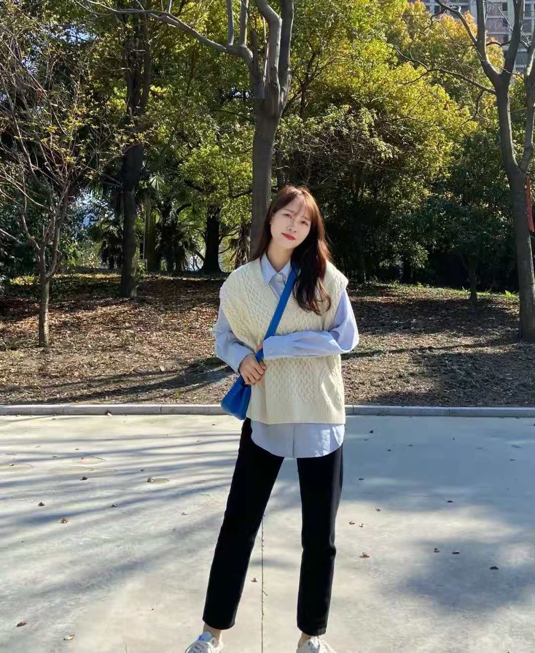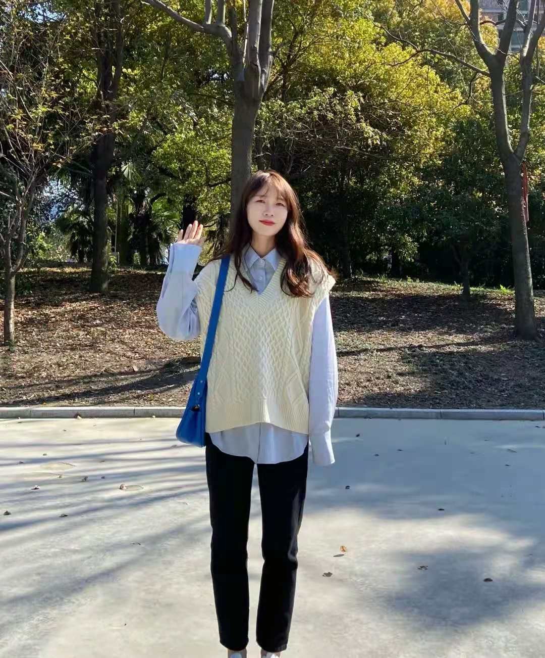 衬衫和针织马甲都是普通的不能再普通的服装单品,看着平平无奇,但叠穿在一起,竟然好看得不得了。