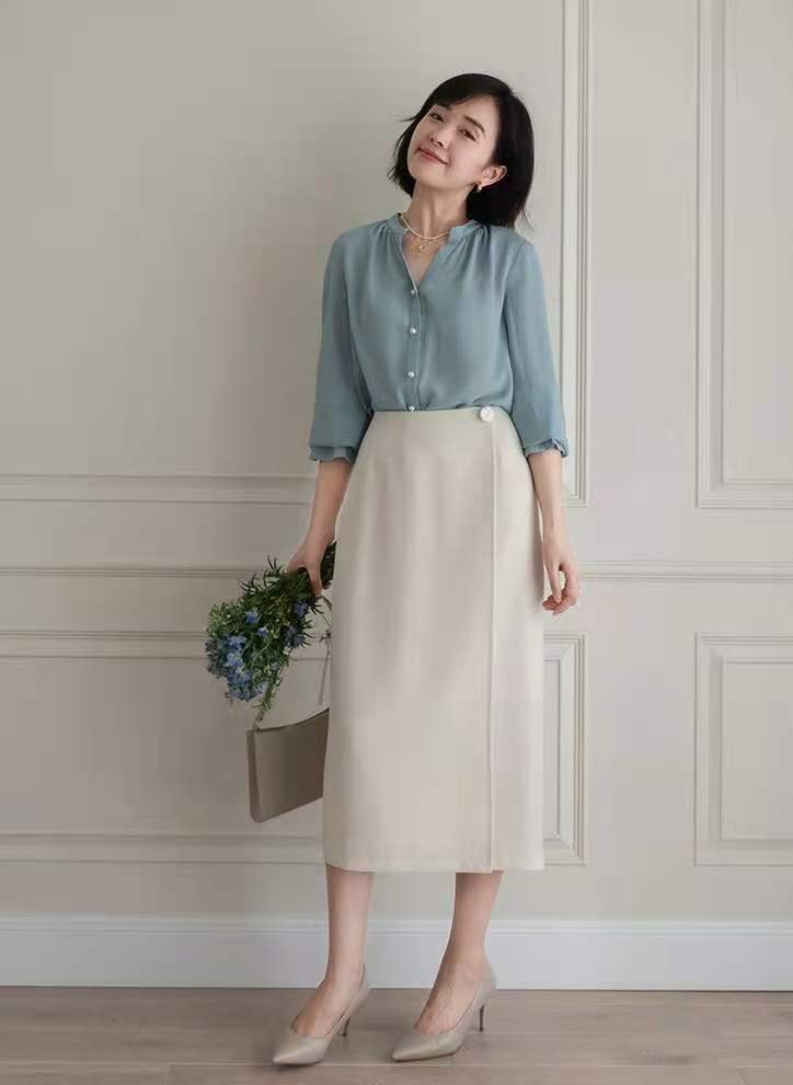 为了不破坏“V领衬衫+半身裙”的高级女人味,我们一定要注意整体造型的配色,建议大家遵循“一深一浅”配色方案,借助于上下衣颜色的深浅变化,既丰富视觉效果,也富有穿搭层次感。