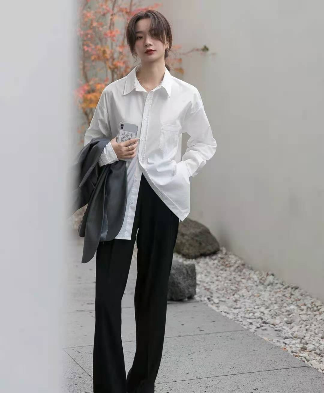 白衬衫是衬衫经典款,色彩干净大方,版型剪裁利落,让人看着格外地舒服,它对于女人来说,就像是一束白月光。在它的衬托下,每个女生都变得干净纯洁。为了不破坏白衬衫这种独特魅力,我们最好可以搭配黑色长裤。黑色色彩暗沉,一来可以衬得白衬衫更加亮眼,二来黑色自带显瘦效果,可以修饰腿型,优化身材比例,显瘦又显高。