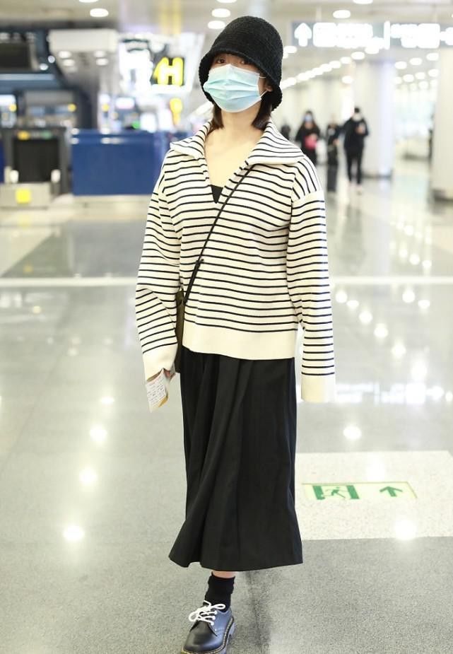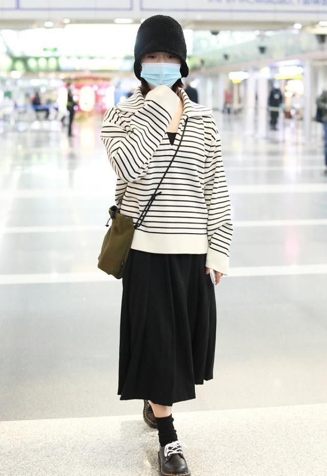 黑白色条纹毛衣是很适合气质温婉文静的女孩子的了,立领的设计更显脸小,能够让人看起来年轻不少,内搭上一件吊带长裙恰到好处的进行线条的修饰。