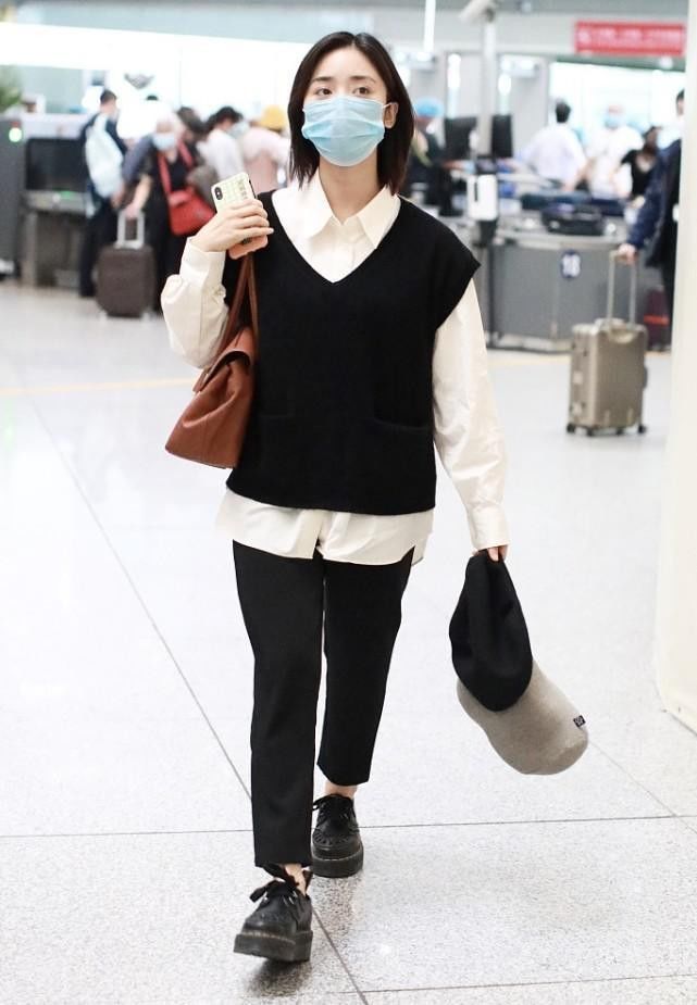 沈月的搭配是真的很值得个子不高的女孩子学习的了,简简单单的黑白色穿搭干净干练又有独特的韵味,白色衬衫采用不规则斜边设计,有了一丝不羁的感觉。