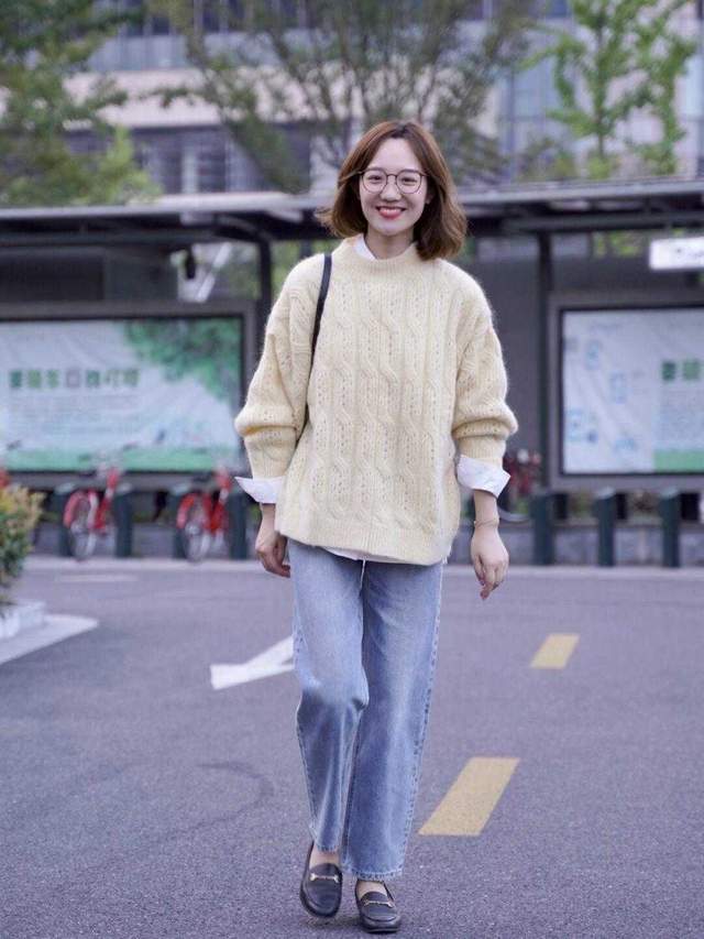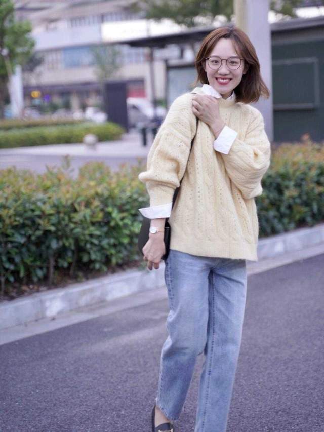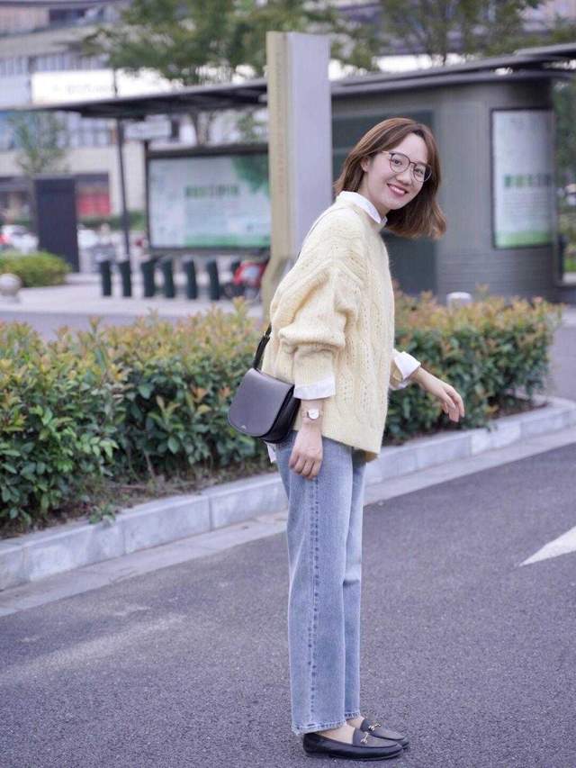 如果很多人不会搭配,就去参考一些时尚博主,也有很多的参考性和借鉴性,特别像这位时尚博主,其实它是属于比较小个子一点的穿搭,直接选择一件黄色的毛衣来叠穿一件白色的衬衫,如果是毛衣叠穿的话,可能选择衬衫会更合适一点,然后再搭配一件浅色的直筒阔腿裤,就会显得宽松又好看,而且还显得小年轻。