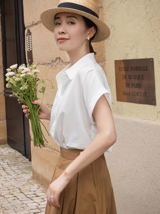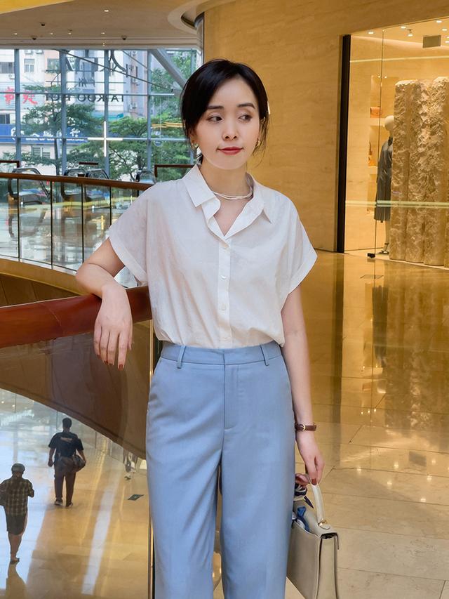 像这样简约复古的翻领短袖白衬衫,不管在什么样的尝试都非常适合, 而且是宽松棉质通勤薄款衬衣的设计,有点微胖的女生穿搭了也是非常的好看,可以很好地修饰你的肉肉,显瘦还显瘦。