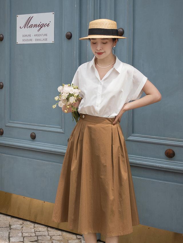 就像下面这套,也是用的白色的衬衫搭配上棕黄色的半身裙,显得非常的青春洋气,带着一款平顶太阳帽,出门游玩的时候,就可以达到一个非常不错的防晒作用,特别好看。