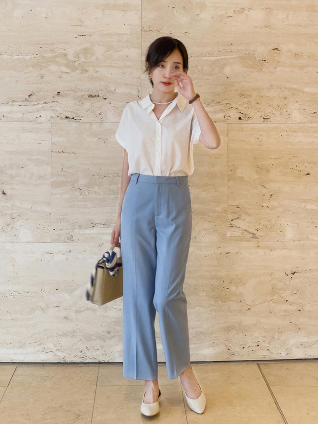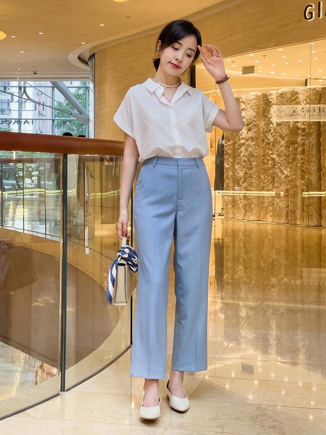 白色的衬衫和西装裤搭配在一起,会不会很古板,这个就得看你选择的西装裤颜色,比如像下面这套穿搭就非常的俏皮洋气,白色的衬衫搭配上浅蓝色的直筒西裤,脚上踩着一双尖头的平底鞋,手里提着一款超级fashion的小包包,依然很有女人味,魅力全开!