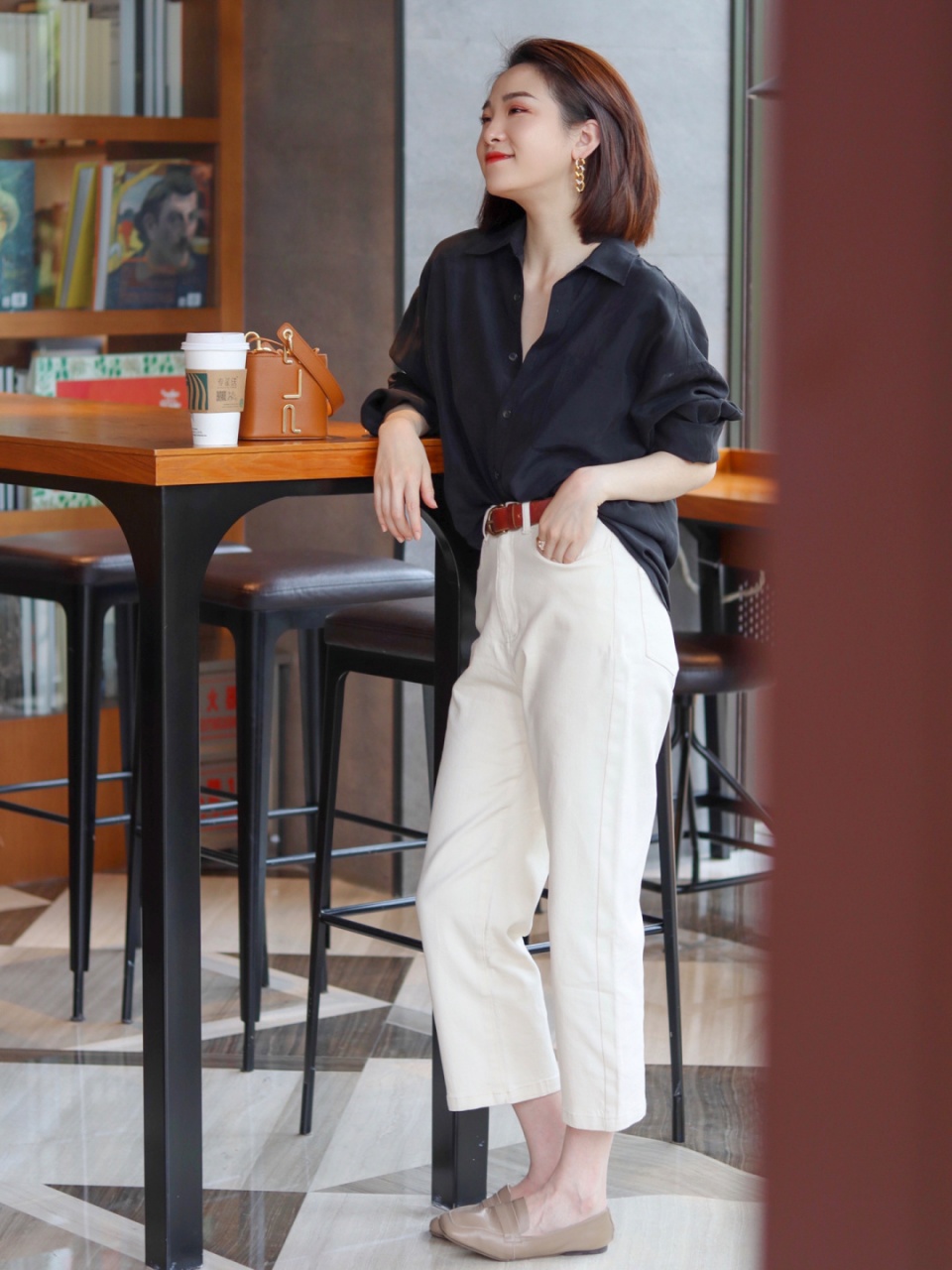 除了大家所熟悉的白衬衫之外,偶尔也可以尝试一下黑色的衬衫,可以带来更多潇洒霸气的时尚魅力,气质上也会完全不一样,黑色比较的内敛霸气,所以在款式选择上到不必过分的硬挺或个性,简单的款式就好了,柔软且带有一定筋骨感的是首选,不会让人感觉严肃高冷,又不会觉得没精神,解开最上面的两颗纽扣,露出颈部的肌肤,不仅能够减缓黑色的沉闷感,而且能够拉长颈部线条,看起来更加的显高显瘦。