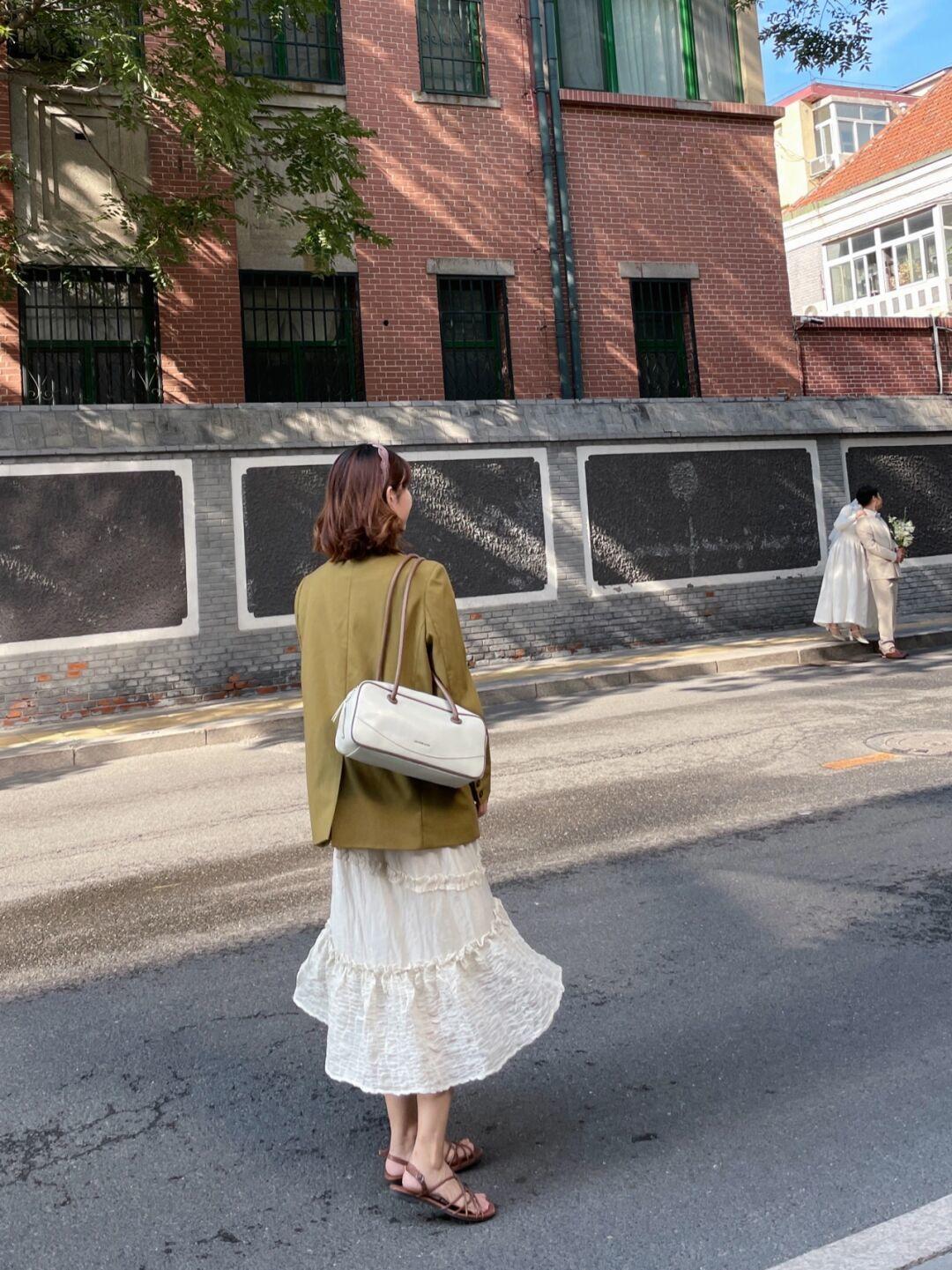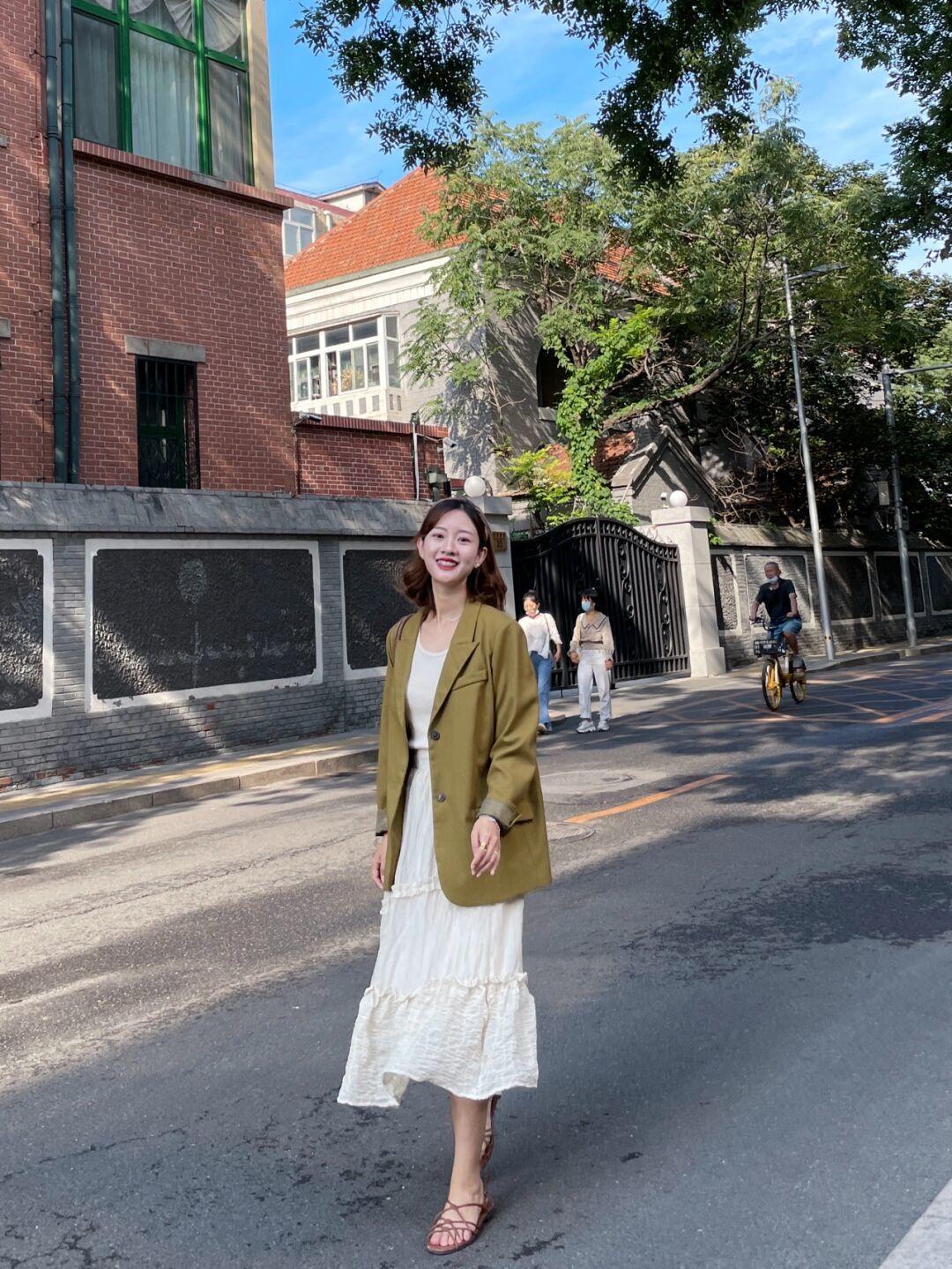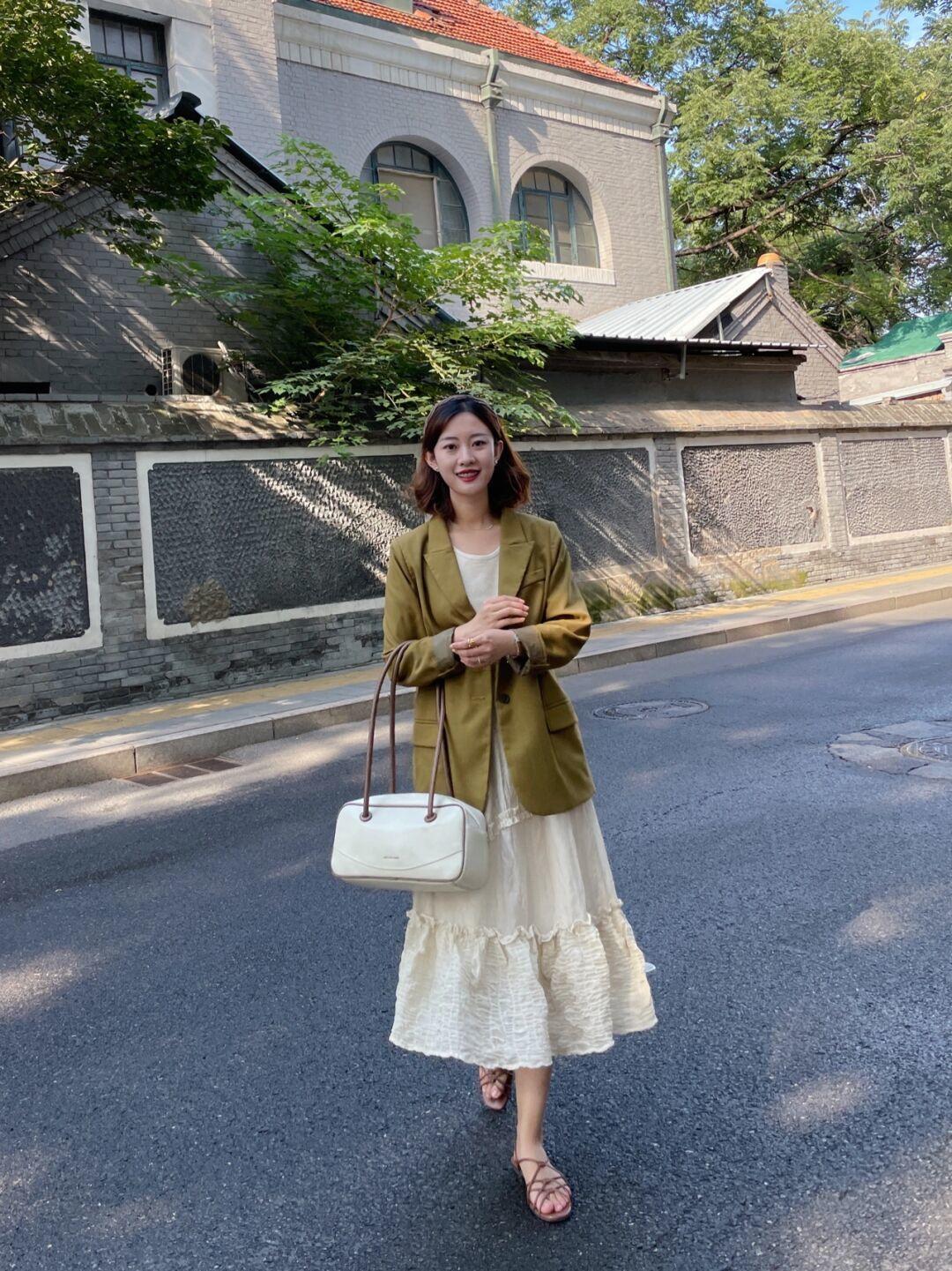 同样是西装外套搭配半身裙的款式,那么你还可以搭配出慵懒又休闲的感觉。就像这位穿搭博主搭配的一样,她选择了一件绿色的西装外套+一条白色的蛋糕裙。搭配起来慵懒又休闲。