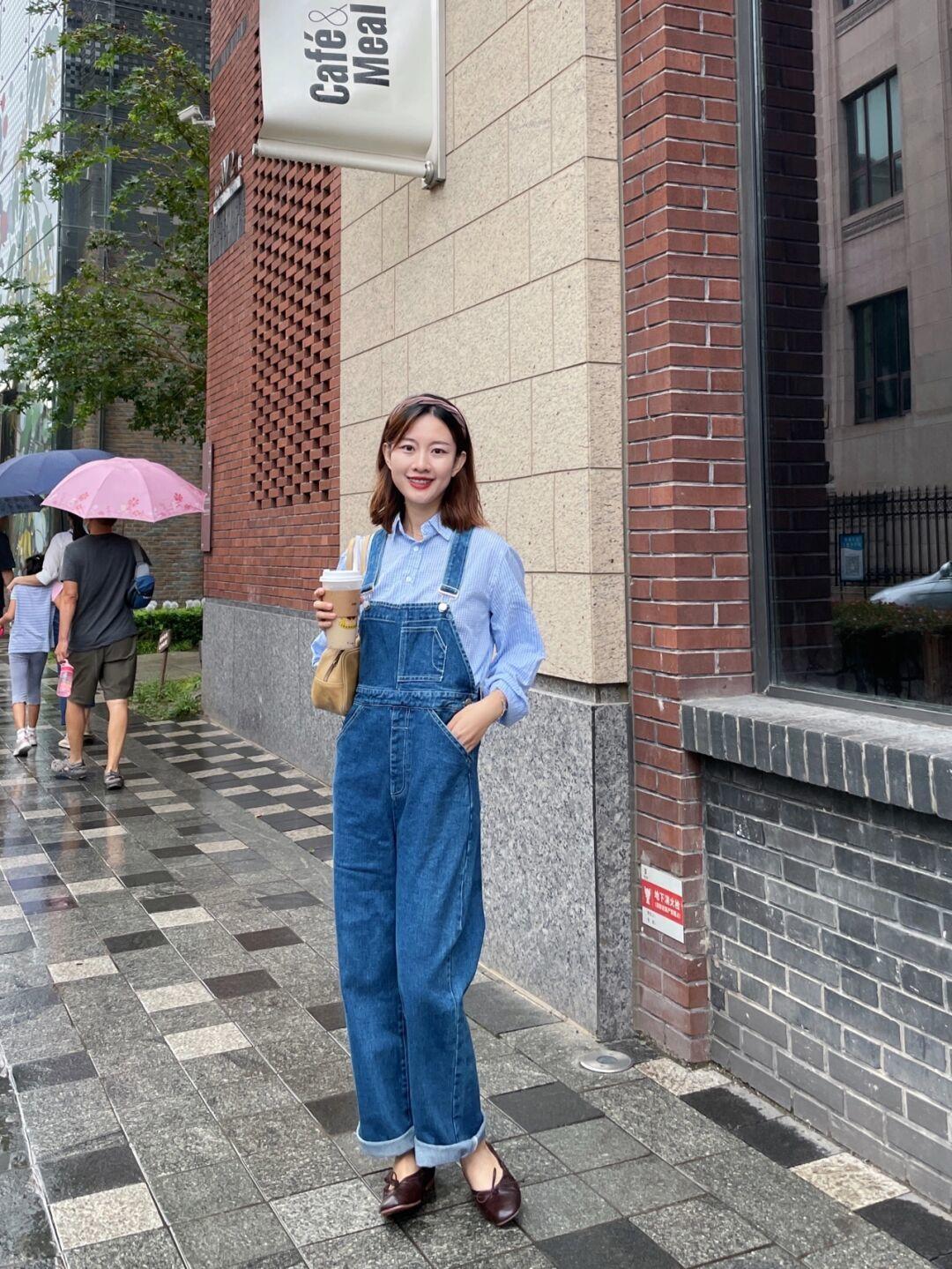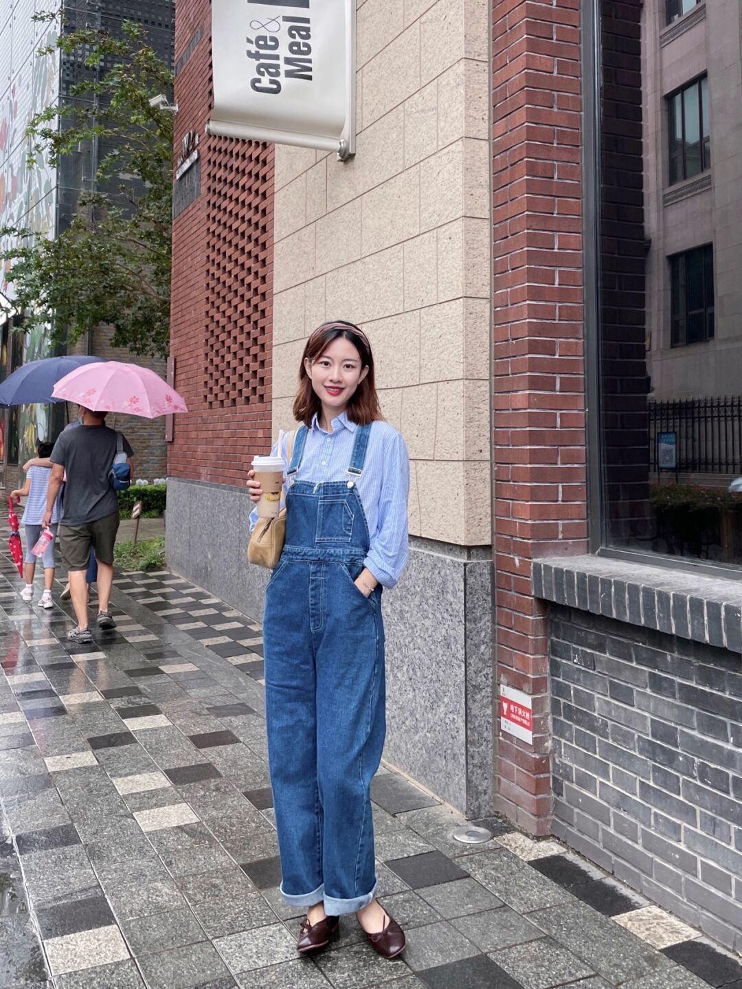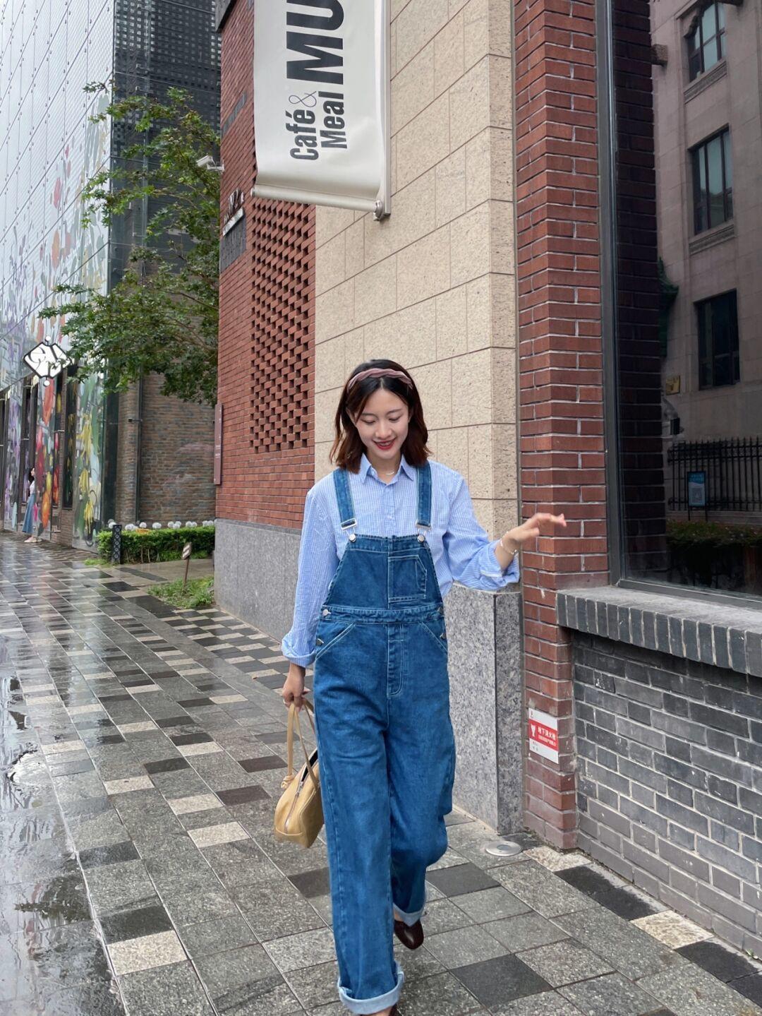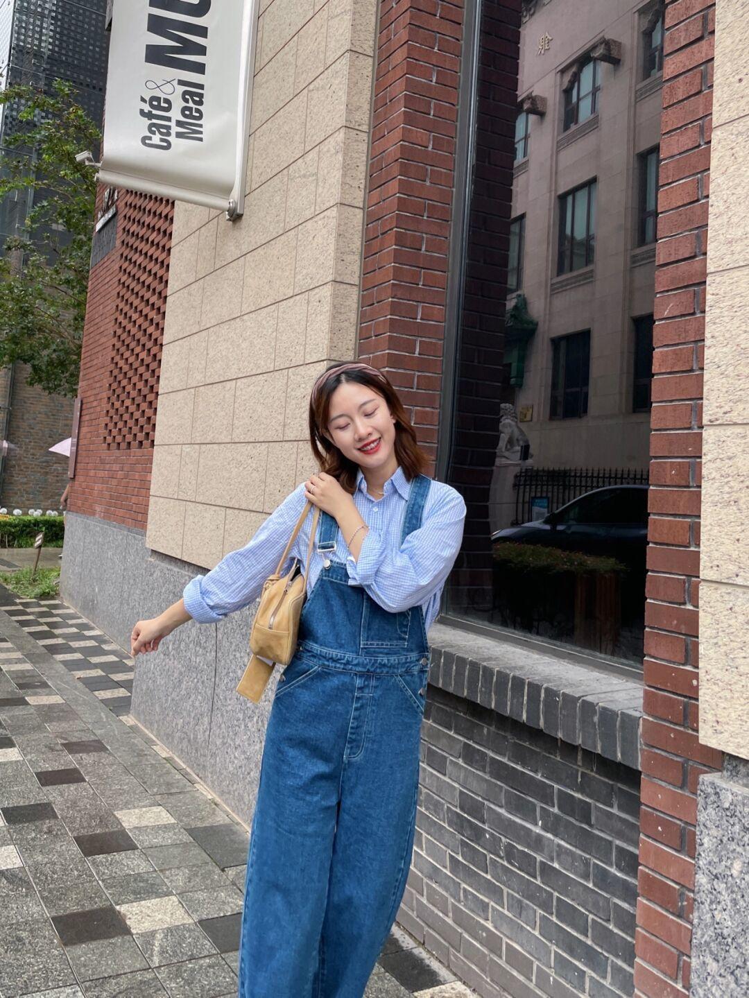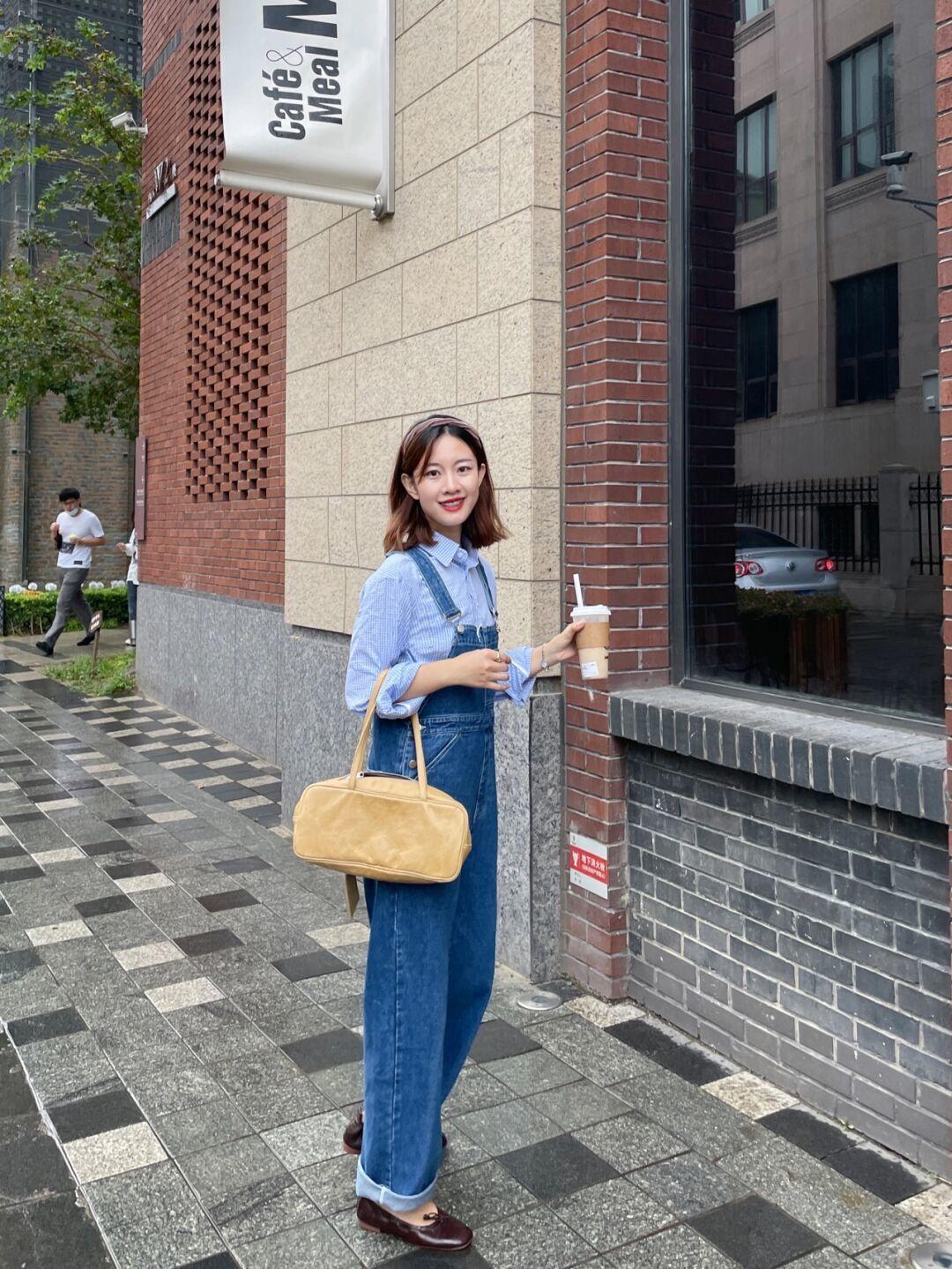 衬衫搭配牛仔裤,可以说是秋天当中最百搭的单品,这条背带裤的颜色是比较深的,而且版型比较宽松,小个子女生穿起来也很好看。