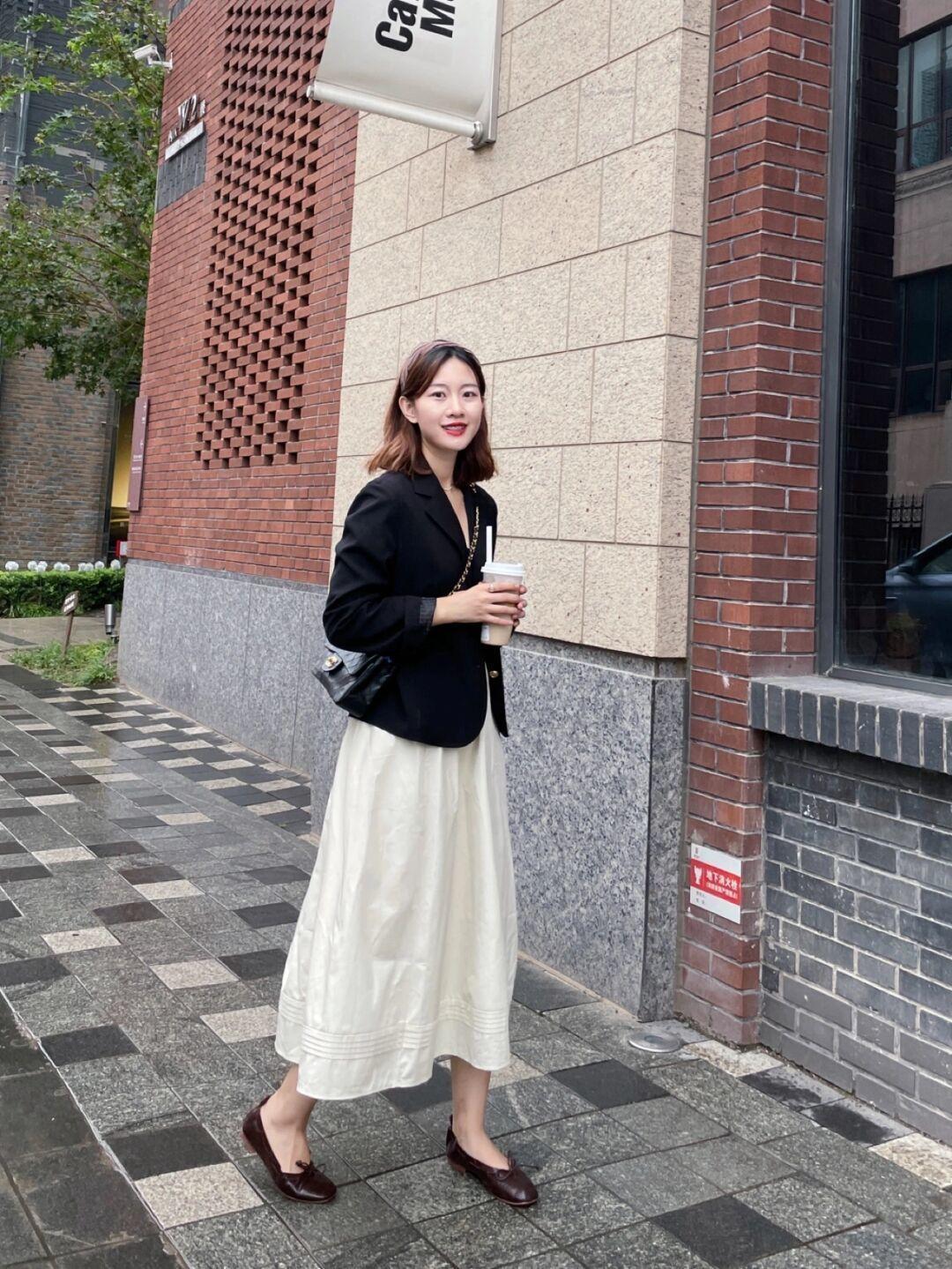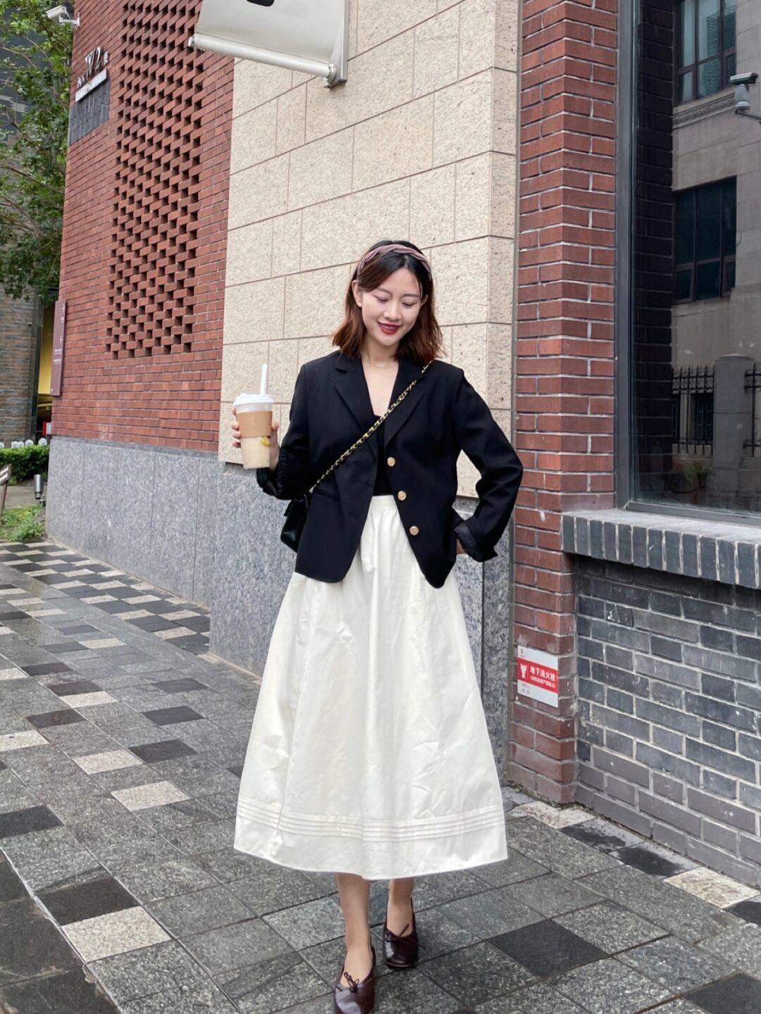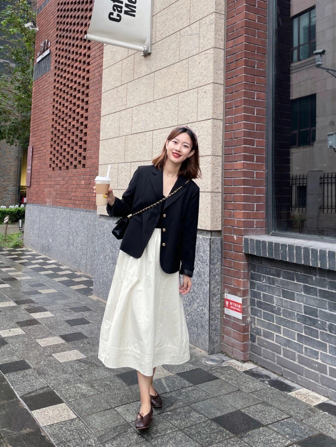 在秋天当中还有一个最百搭的单品,那就是西装外套。就像这位穿搭博主上身选择了一件短款的黑色西装外套,搭配一条白色的半身裙,整体看起来气质又优雅。