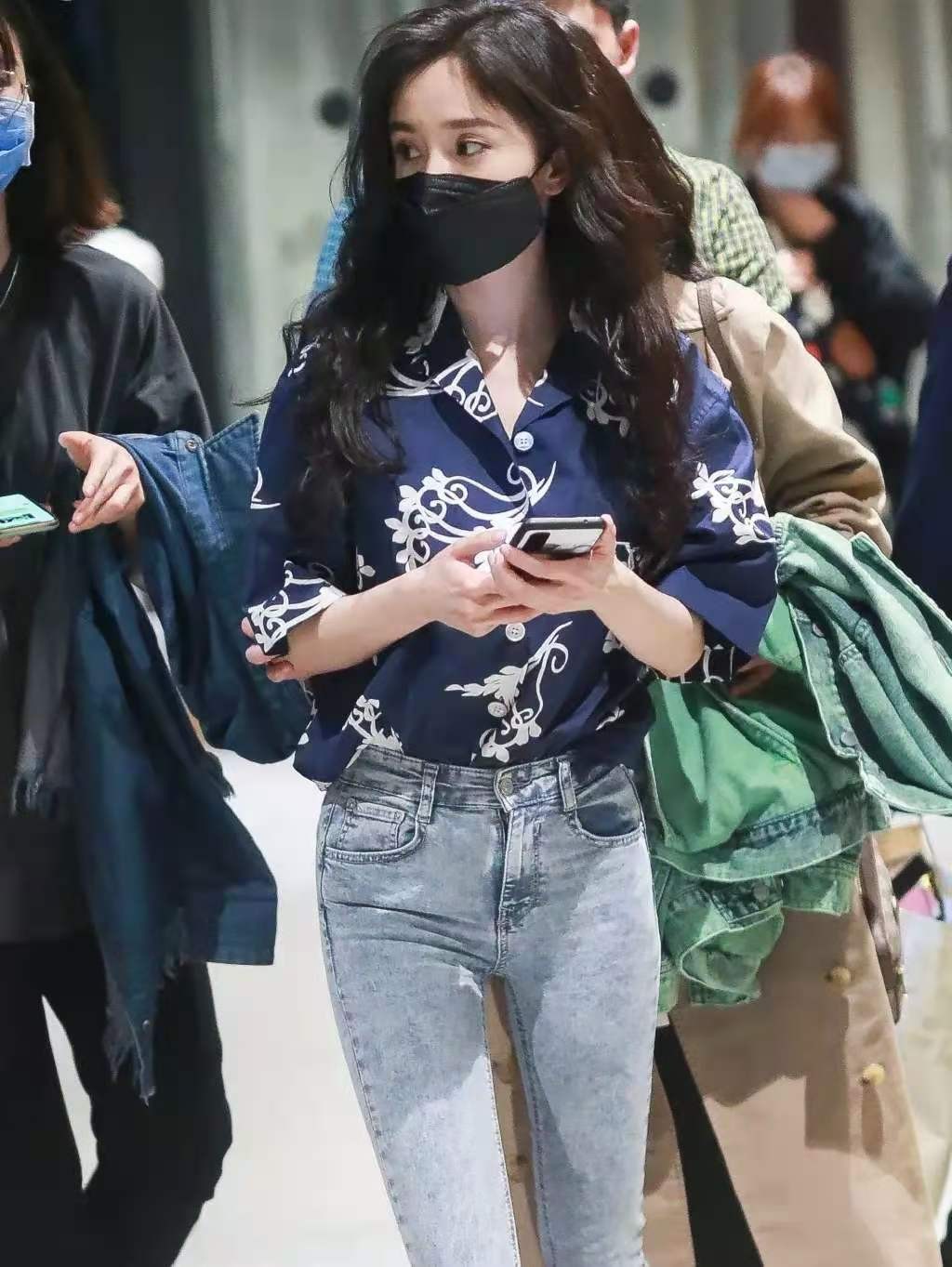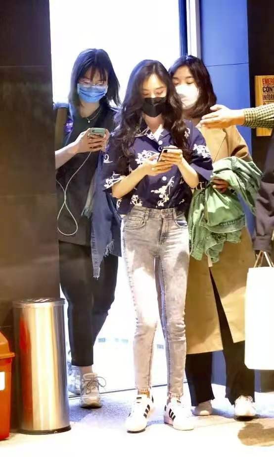杨幂印花衬衫配牛仔裤造型解析